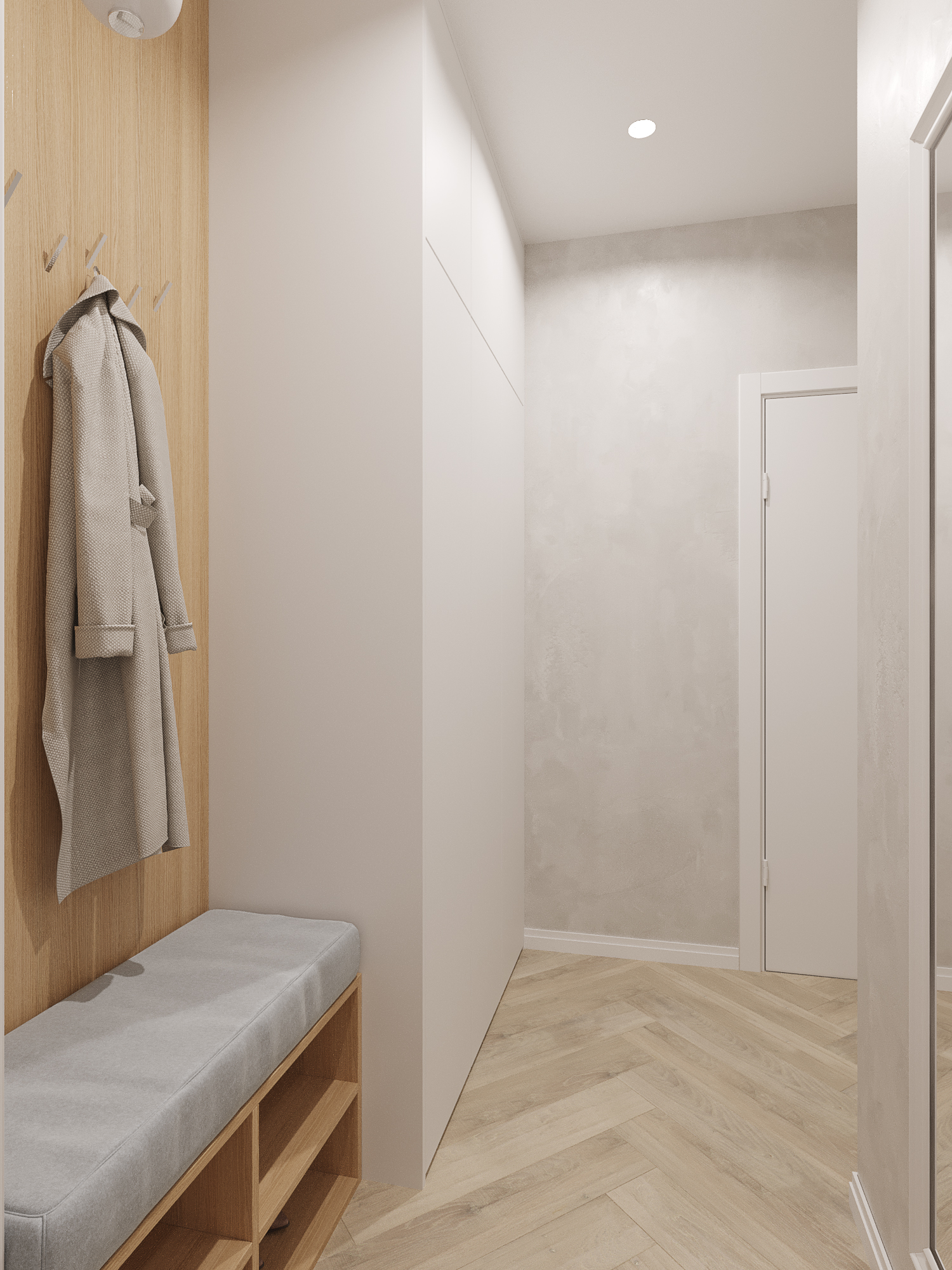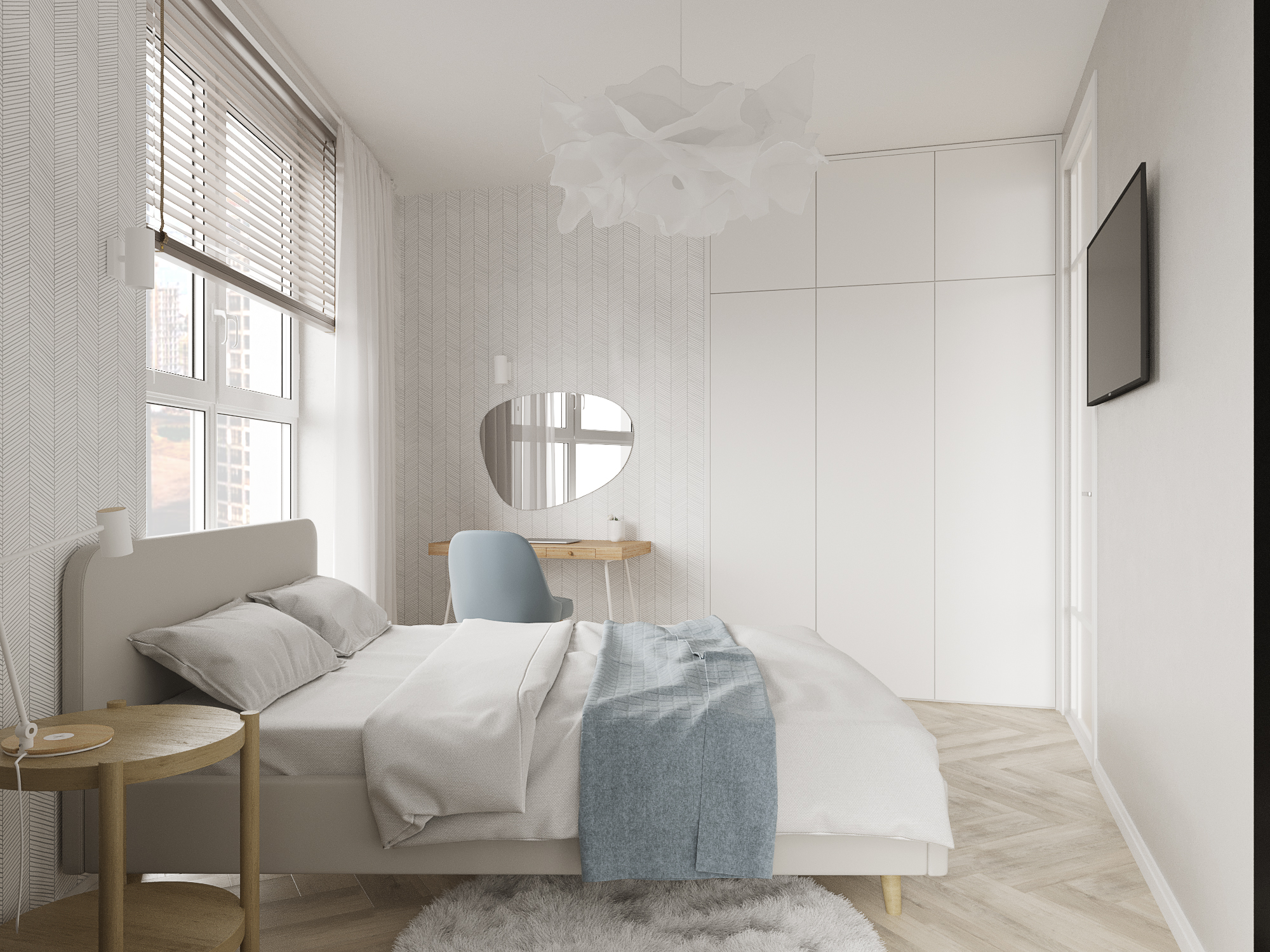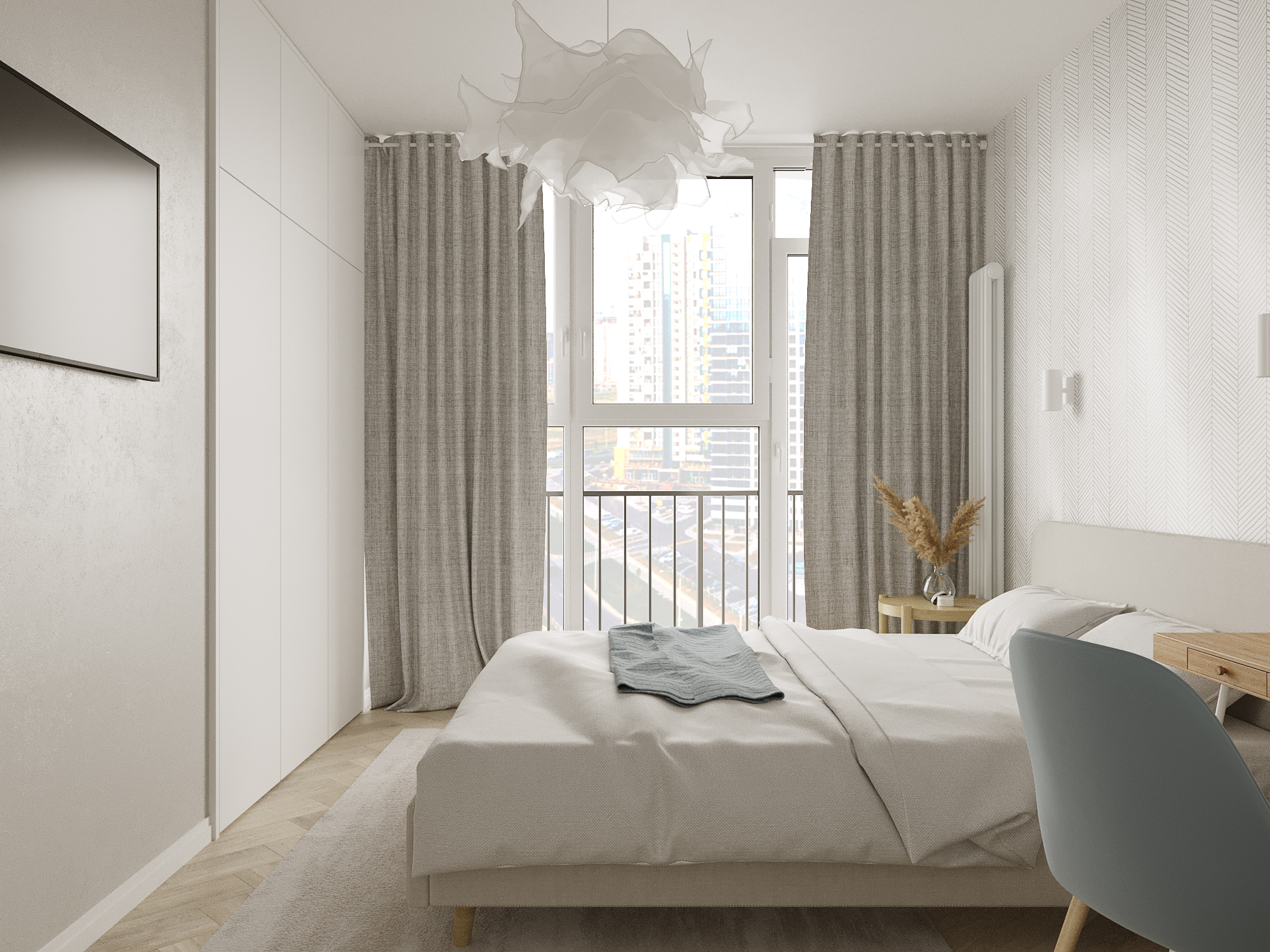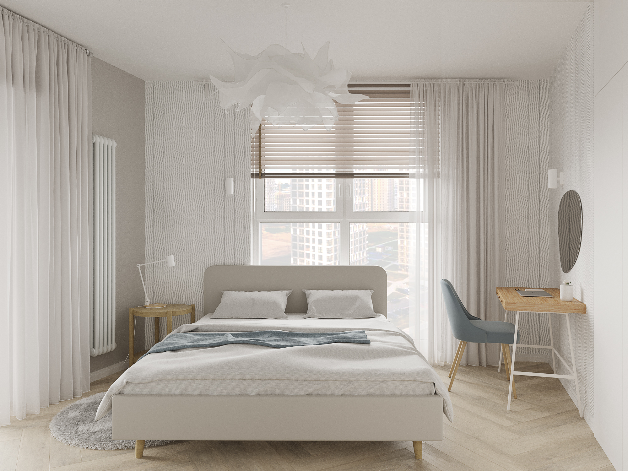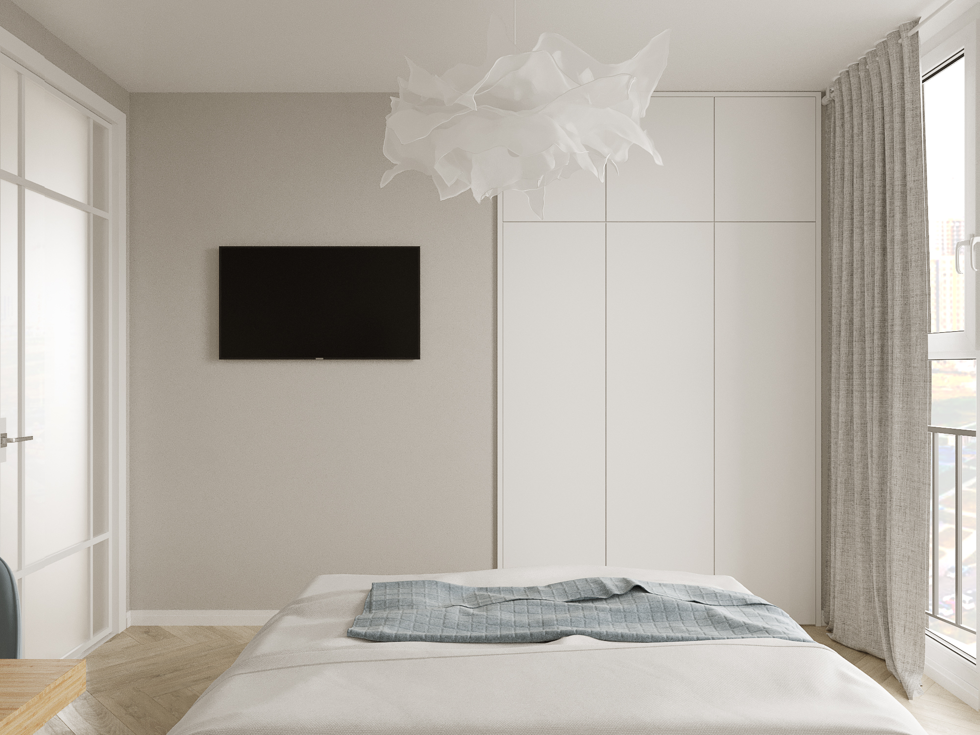 Проект квартиры в Минске для двух сестер. На «свободной планировке» мы организовали кухню-гостиную, две спальни и раздельные санузлы. Чтобы в коридор попадало больше света сделали высокие остекленные двери. В спальнях организовали ниши для встроенных шкафов — так они не выглядят слишком массивно.