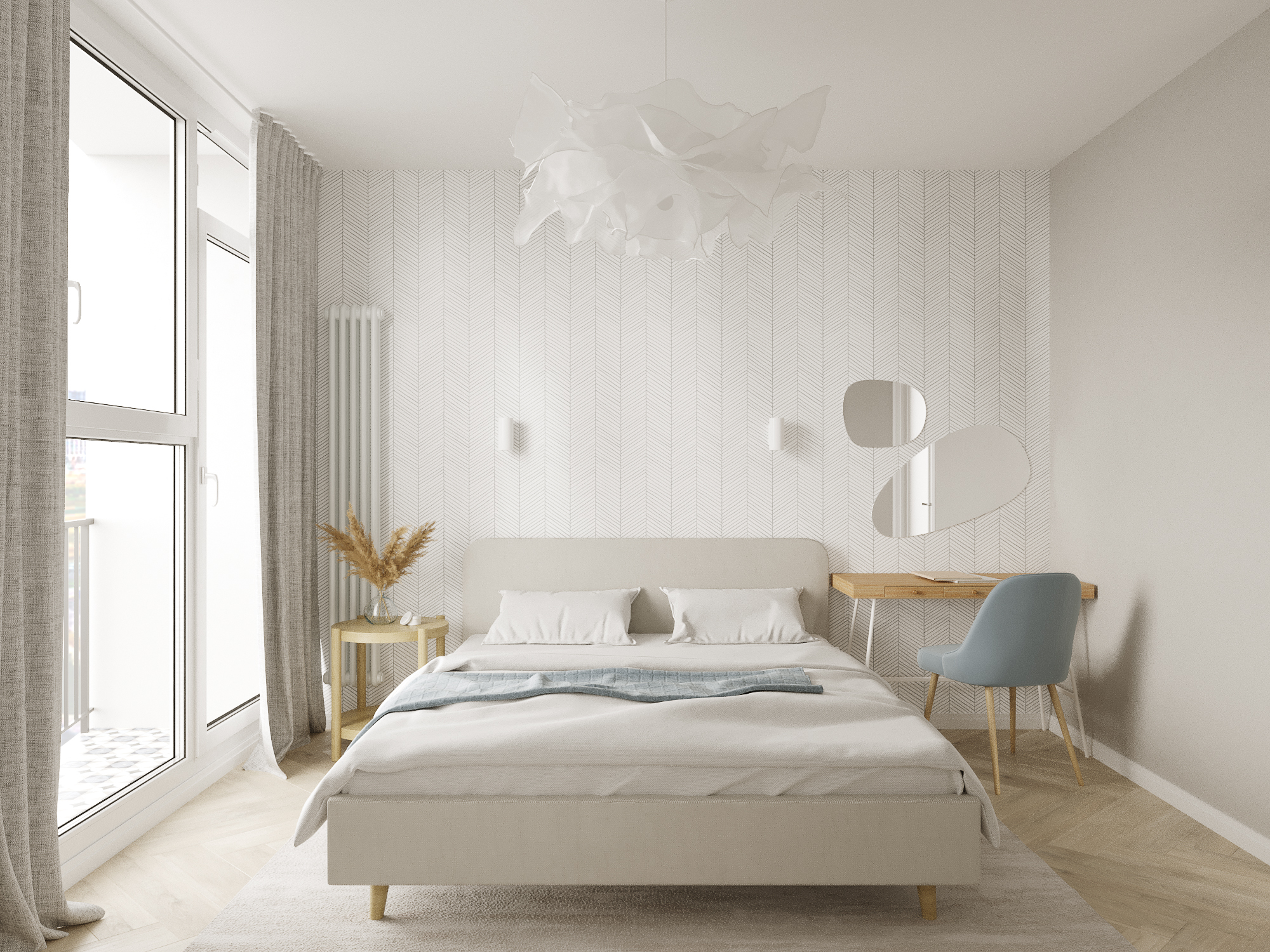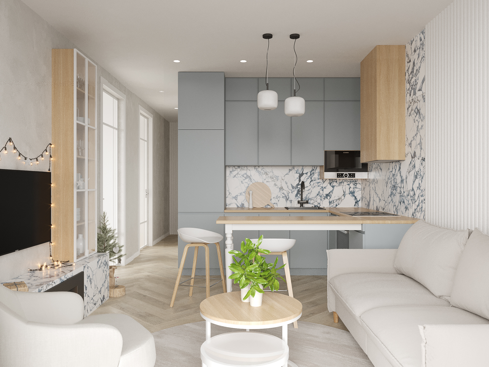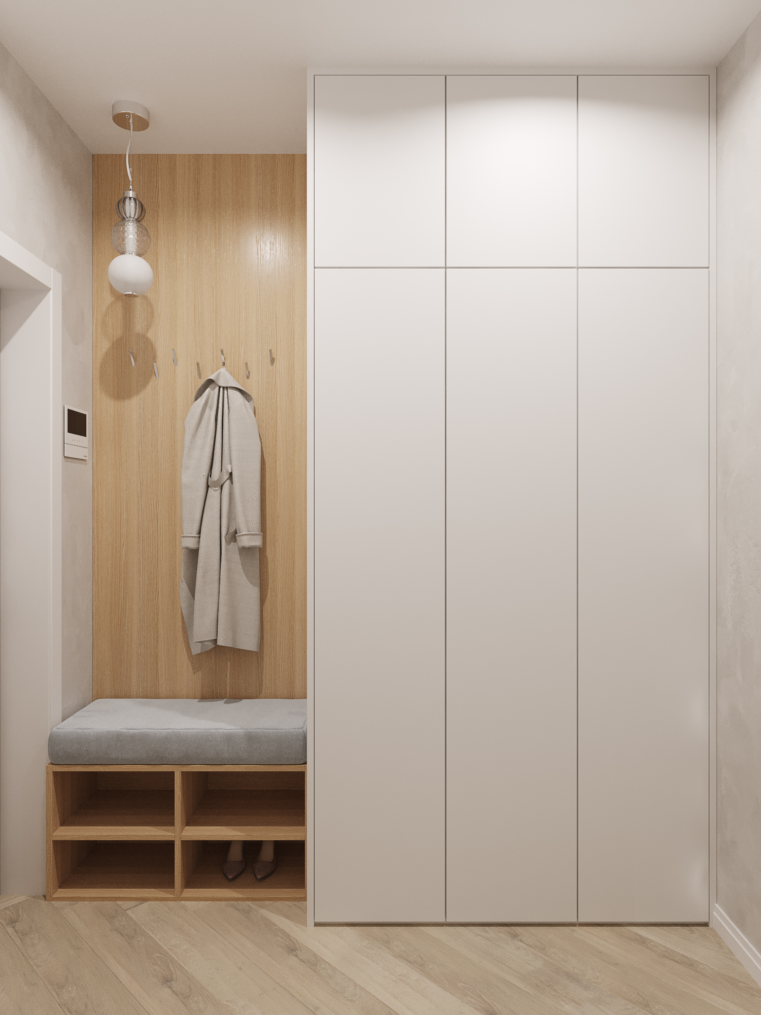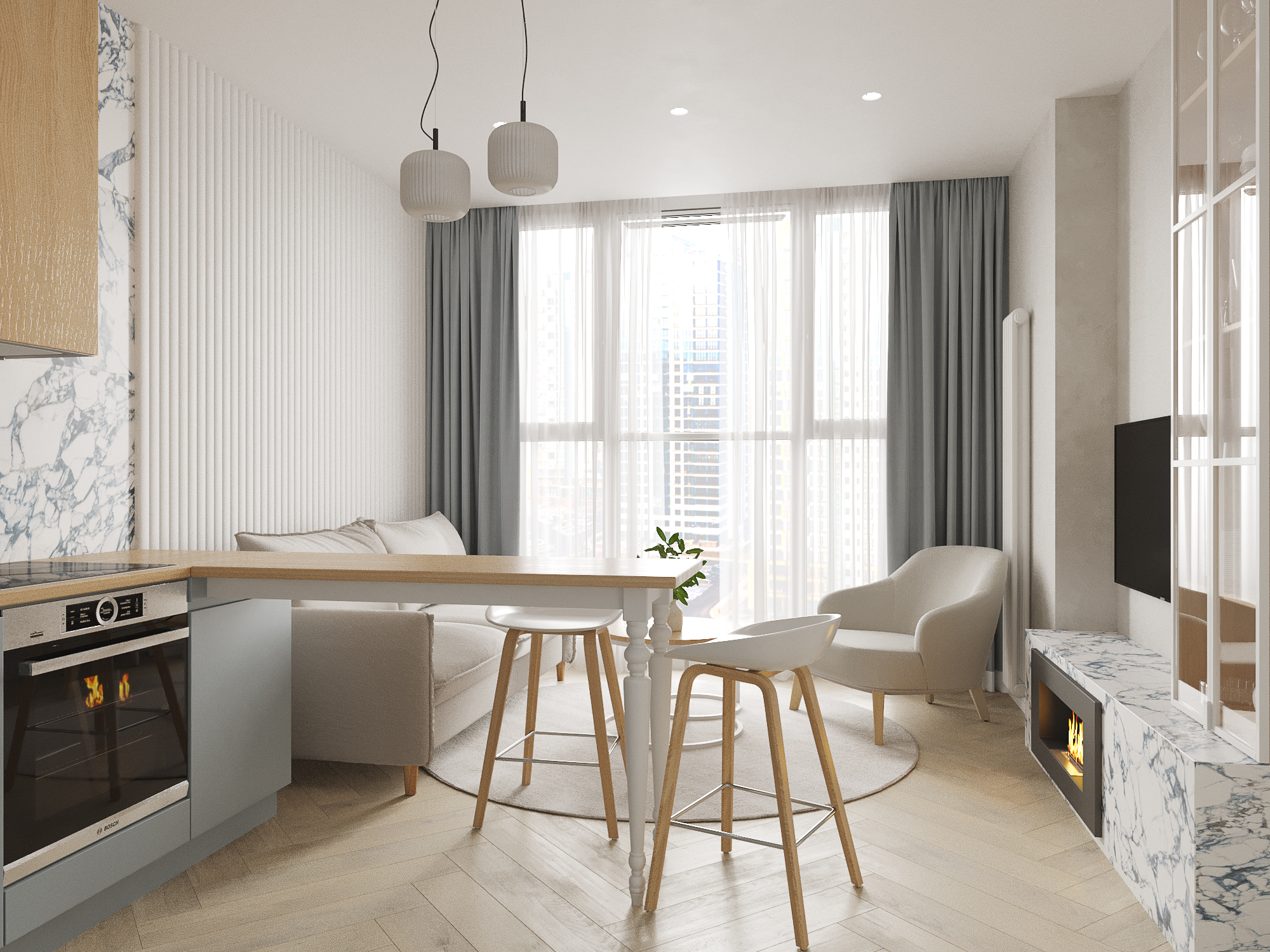 Проект квартиры в Минске для двух сестер. На «свободной планировке» мы организовали кухню-гостиную, две спальни и раздельные санузлы. Чтобы в коридор попадало больше света сделали высокие остекленные двери. В спальнях организовали ниши для встроенных шкафов — так они не выглядят слишком массивно.
