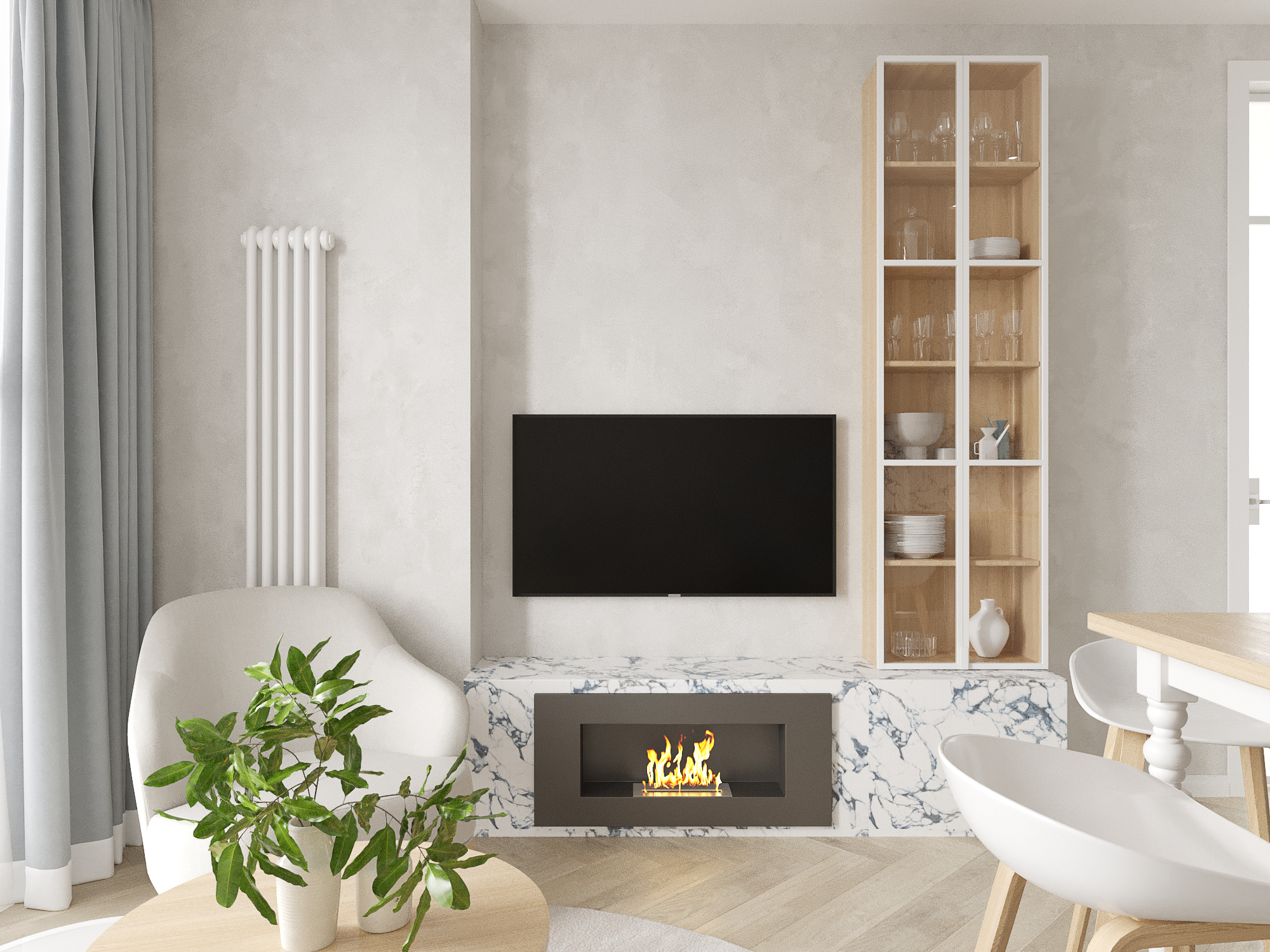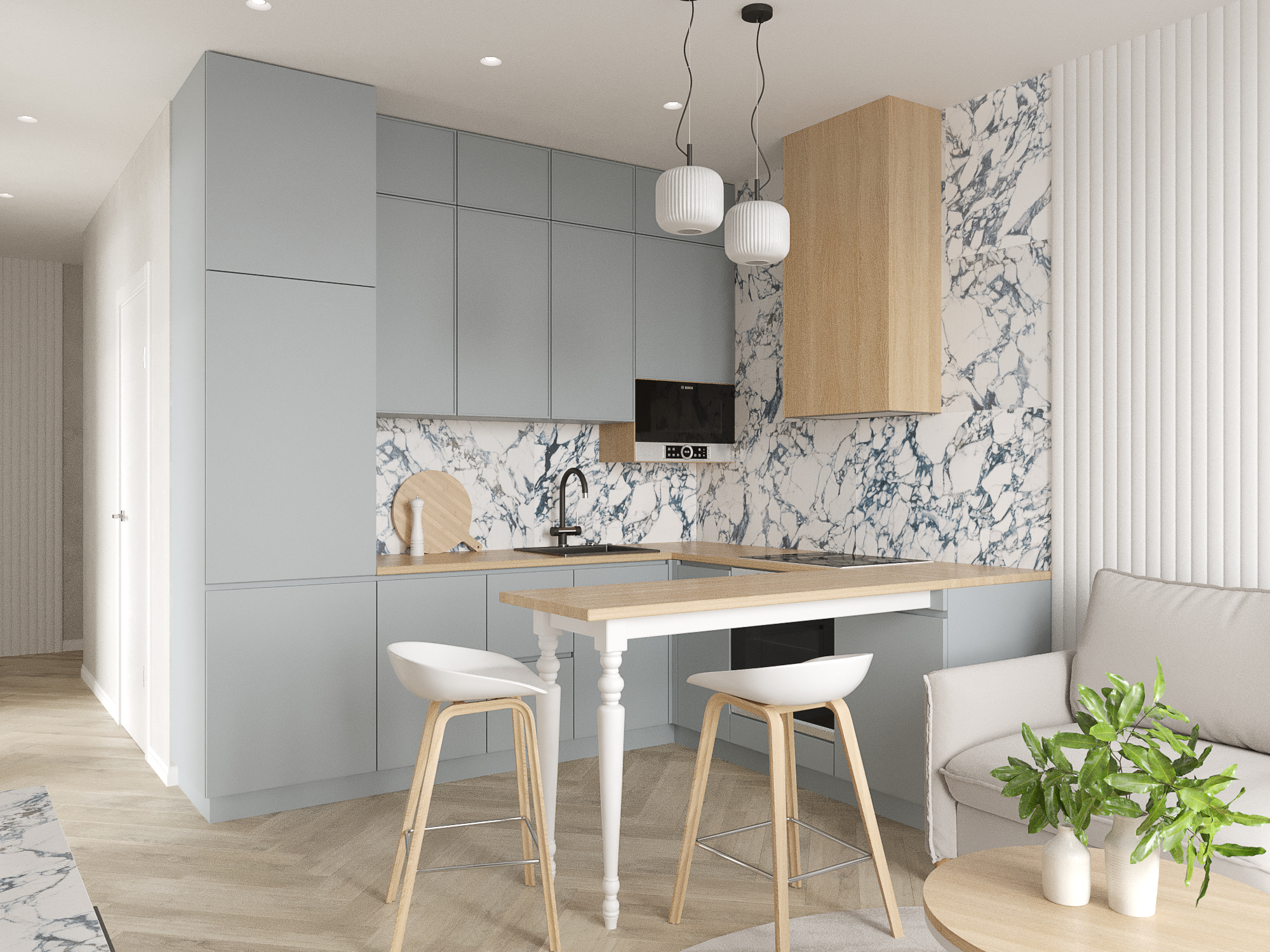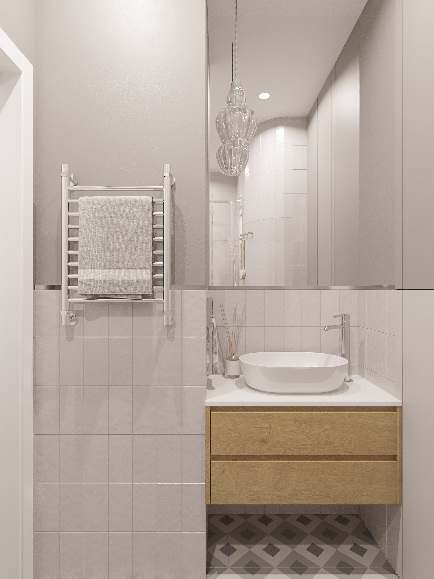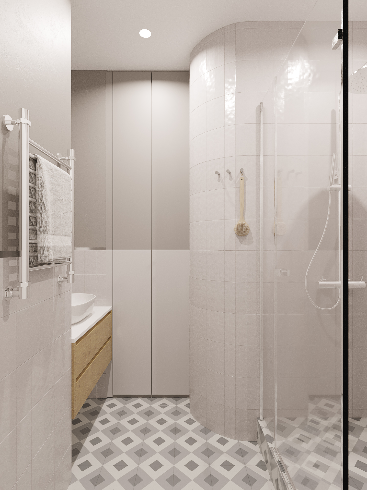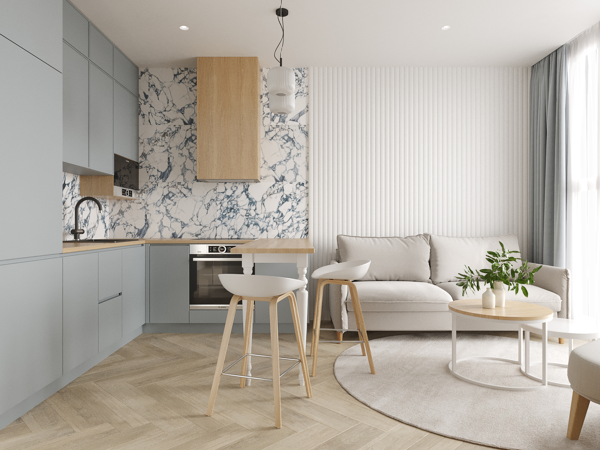 Проект квартиры в Минске для двух сестер. На «свободной планировке» мы организовали кухню-гостиную, две спальни и раздельные санузлы. Чтобы в коридор попадало больше света сделали высокие остекленные двери. В спальнях организовали ниши для встроенных шкафов — так они не выглядят слишком массивно.