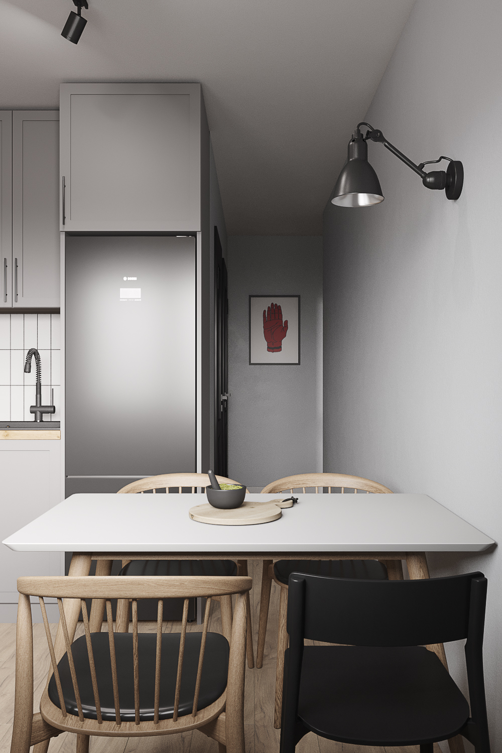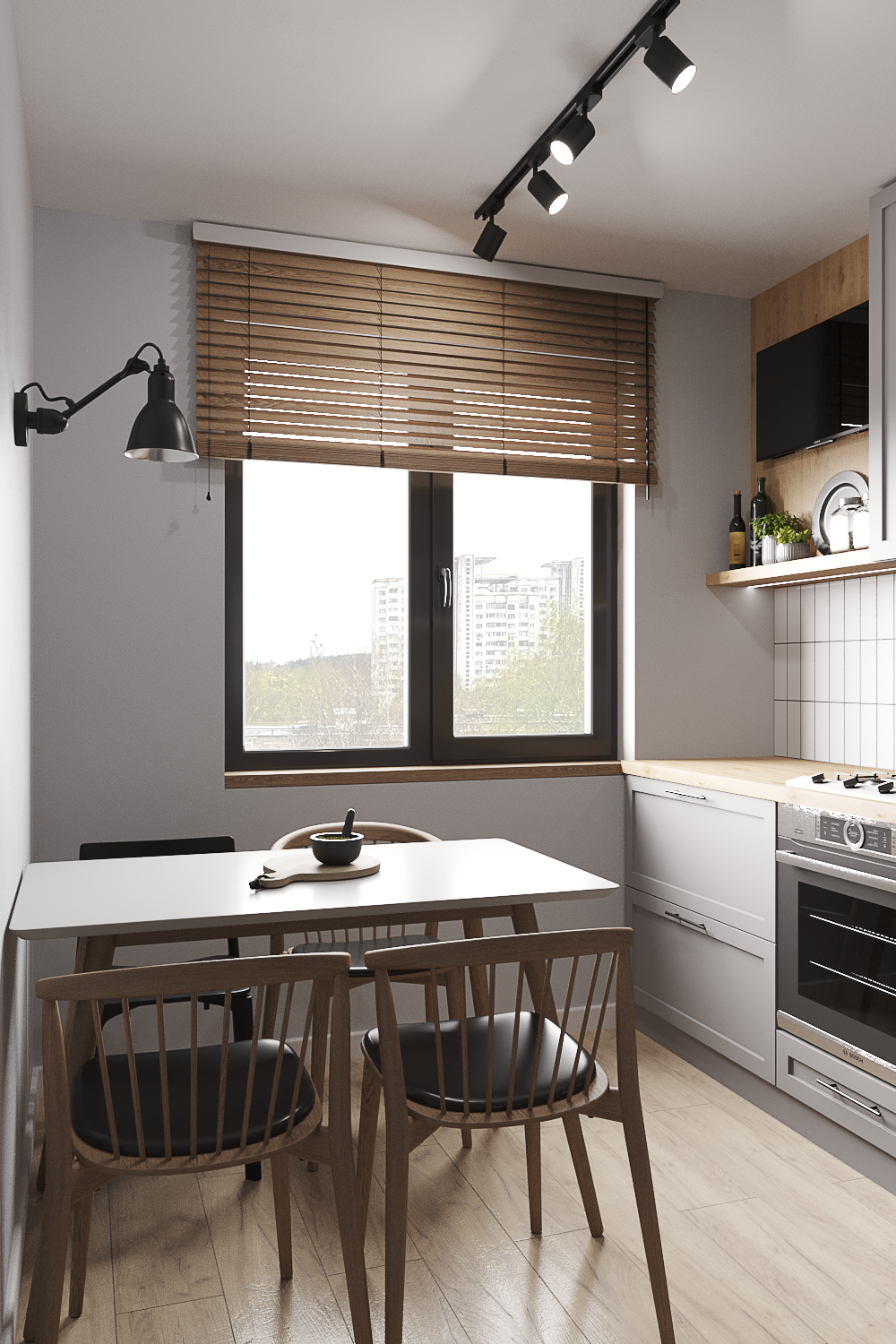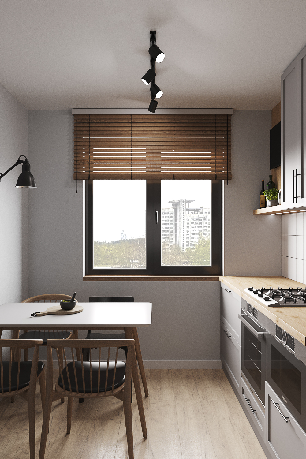 Квартира находится в панельном доме 60-х годов постройки. При разработке дизайна я учитывала этот факт. Поэтому был выбран стиль современного модернизма в серых тонах с использованием натурального дерева и фанеры.