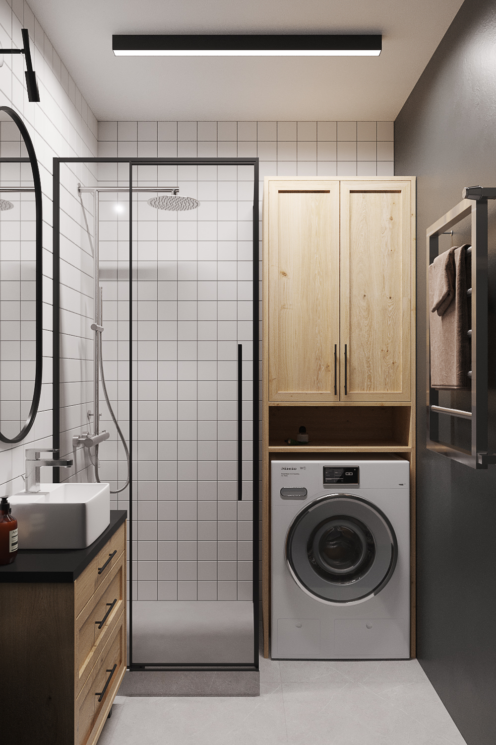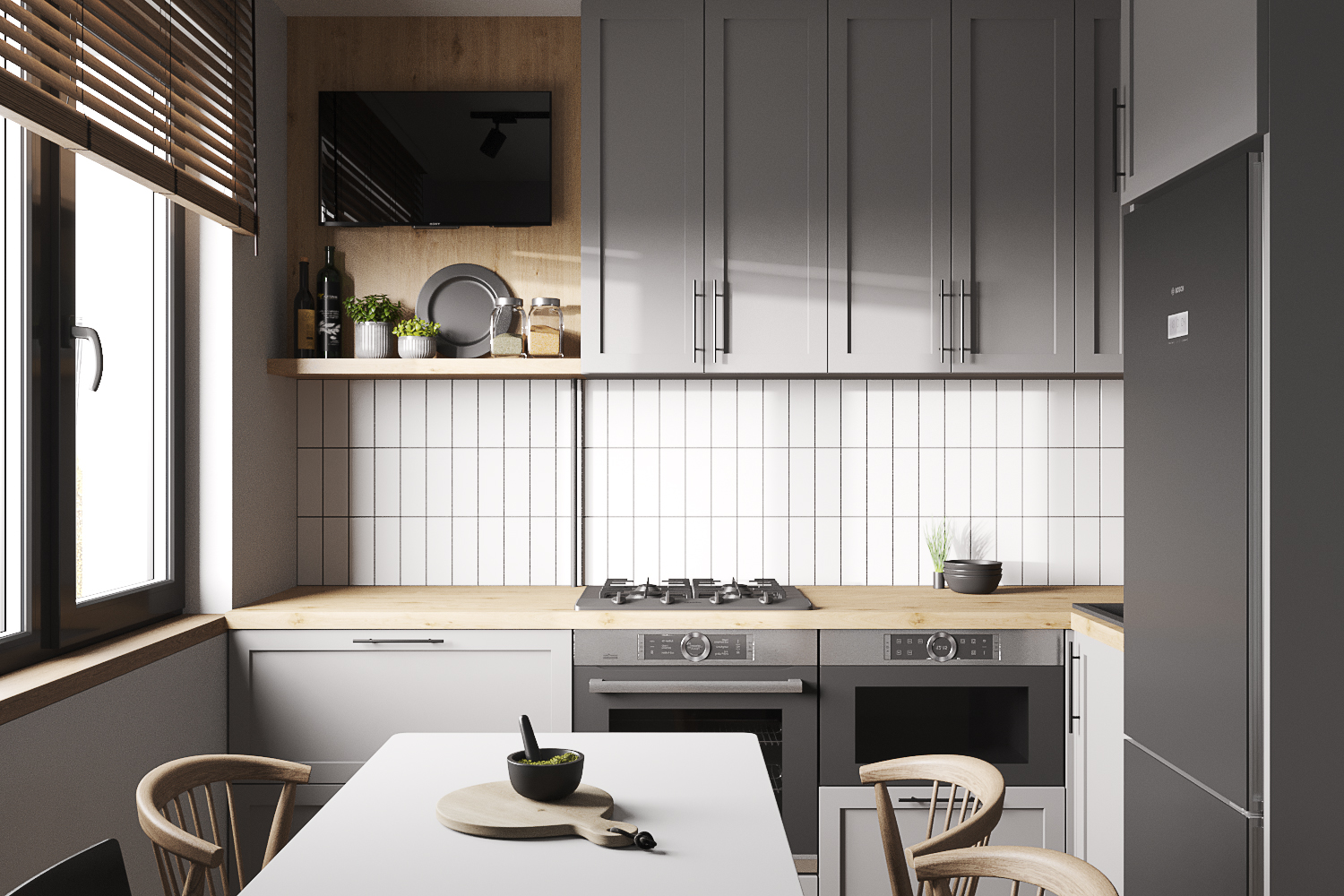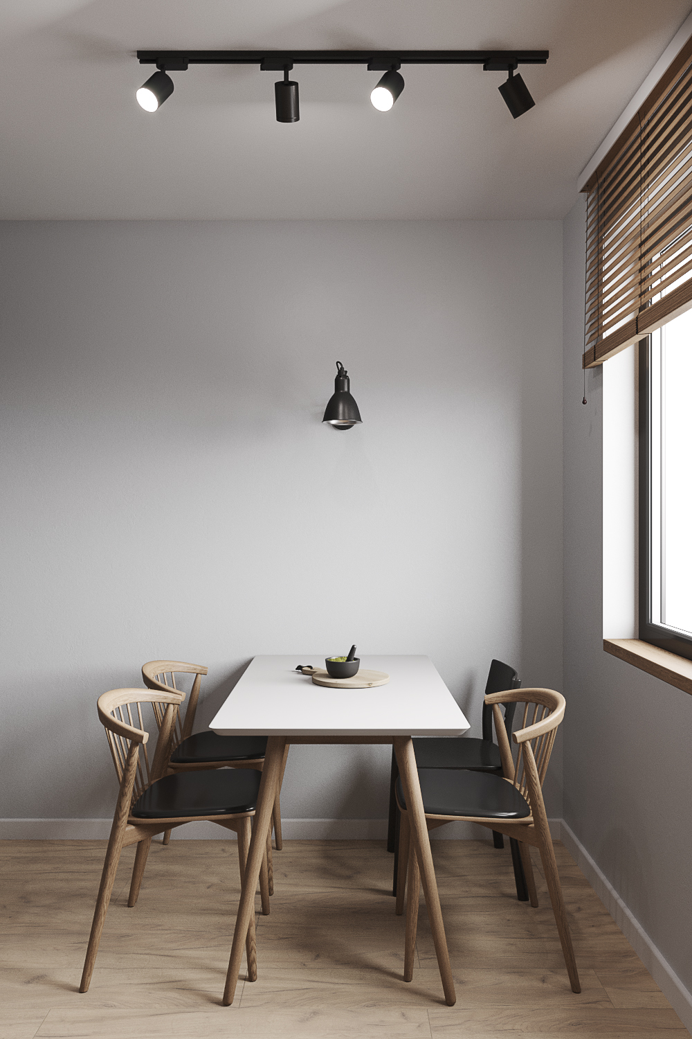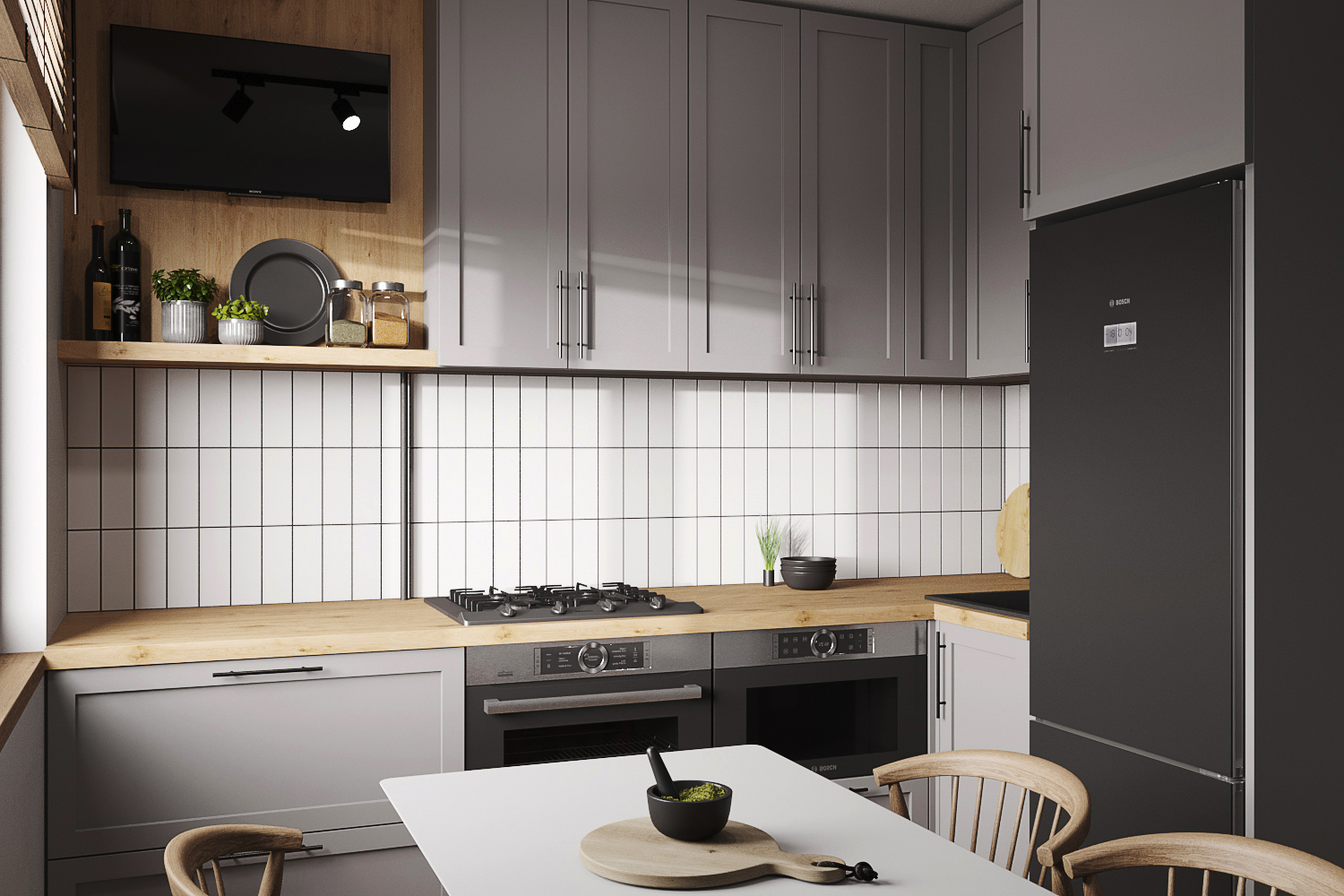 Квартира находится в панельном доме 60-х годов постройки. При разработке дизайна я учитывала этот факт. Поэтому был выбран стиль современного модернизма в серых тонах с использованием натурального дерева и фанеры.