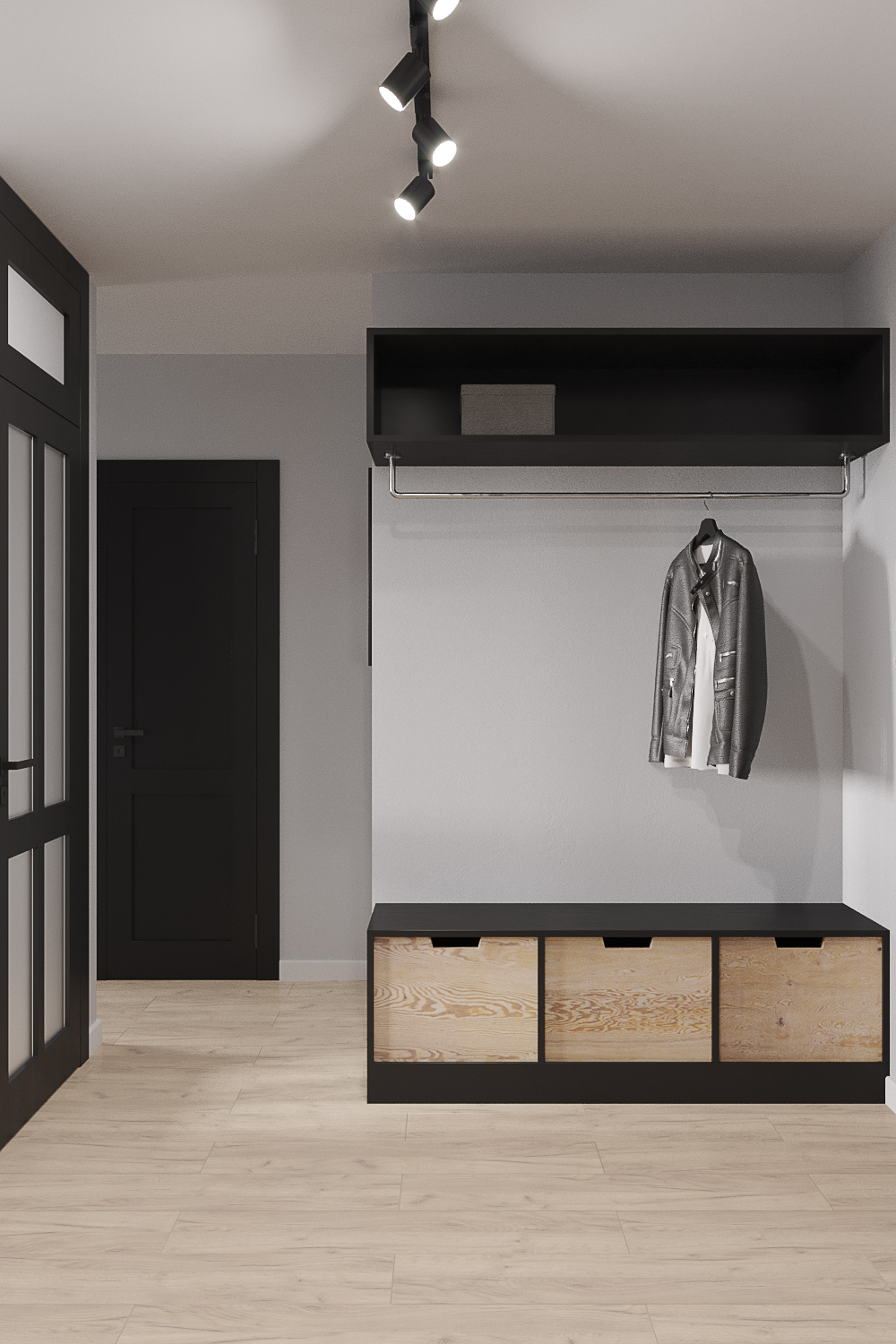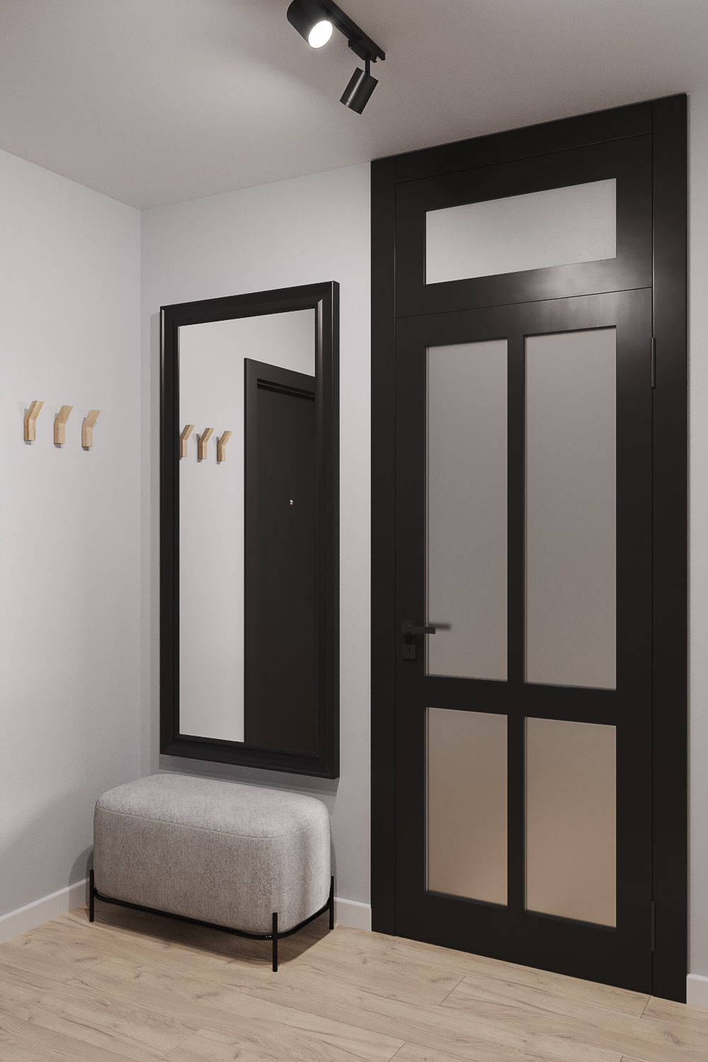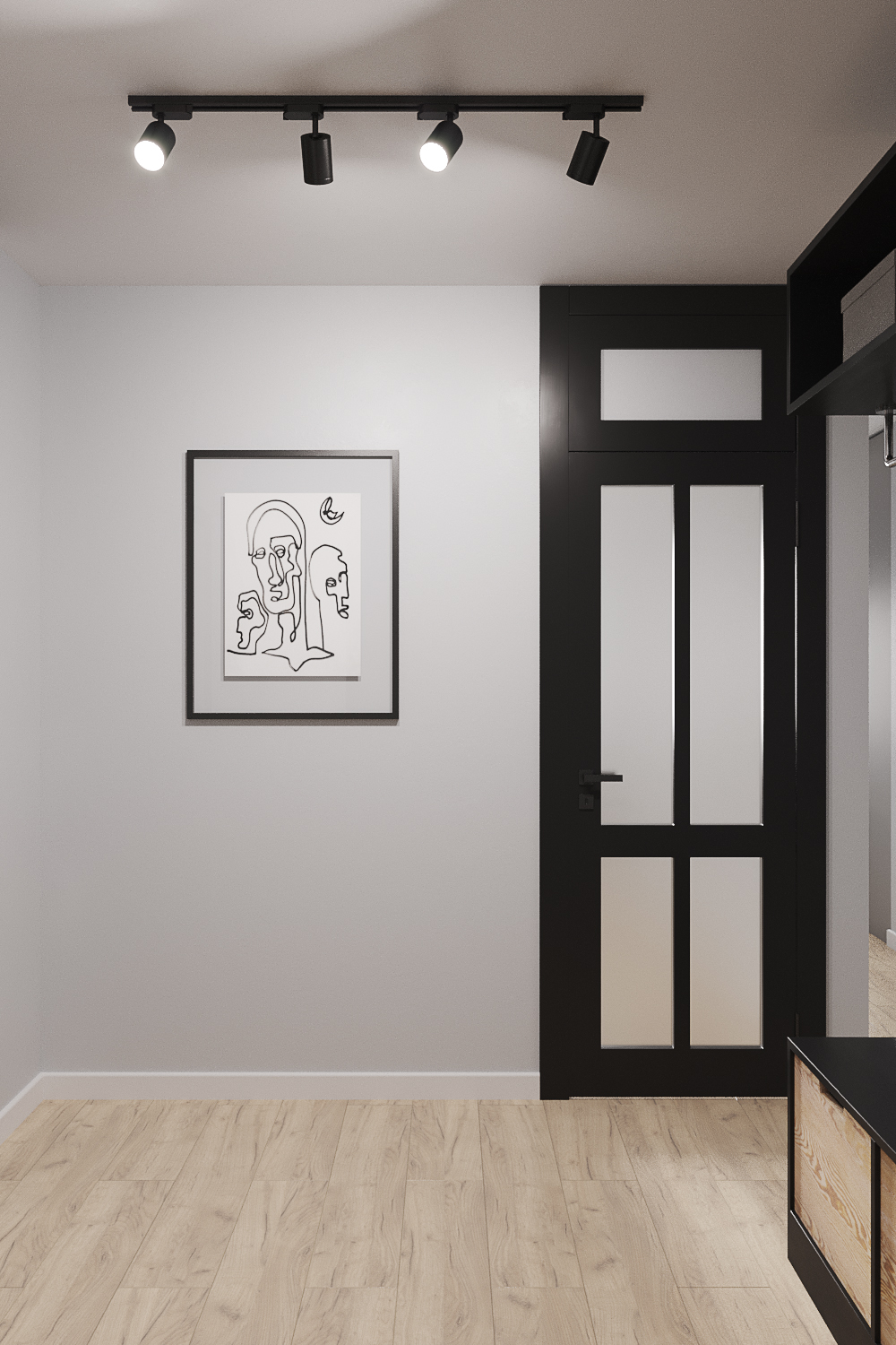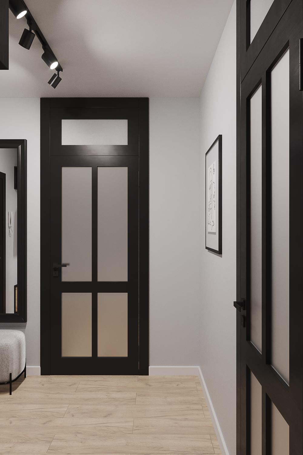 Главным акцентом стали черные двери с фальш фрамугами в потолок.