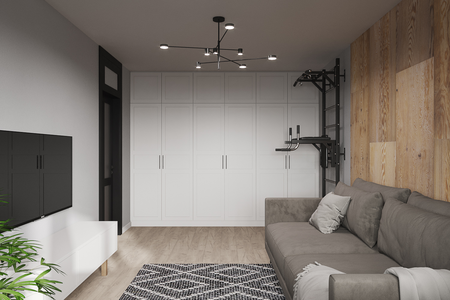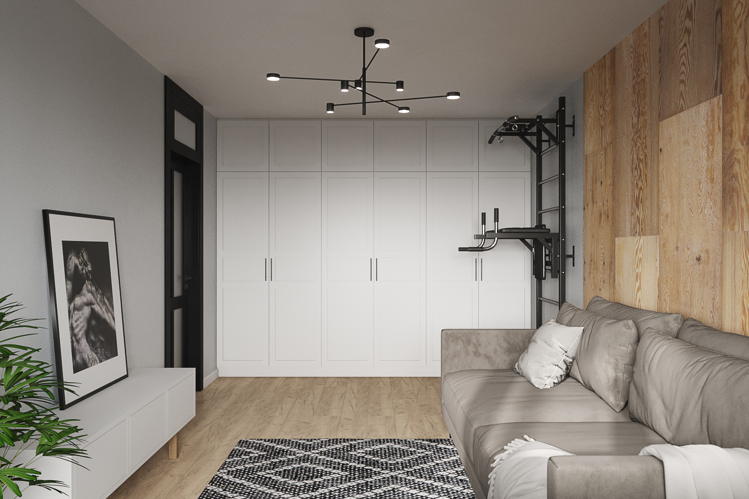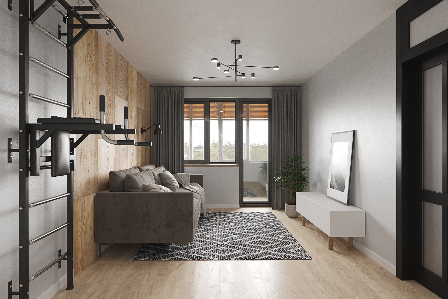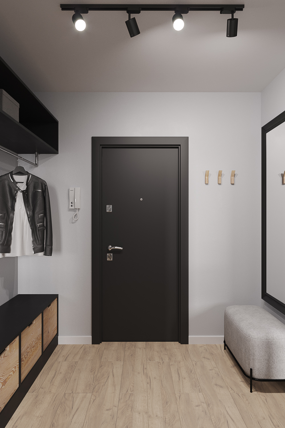 Главным акцентом стали черные двери с фальш фрамугами в потолок.