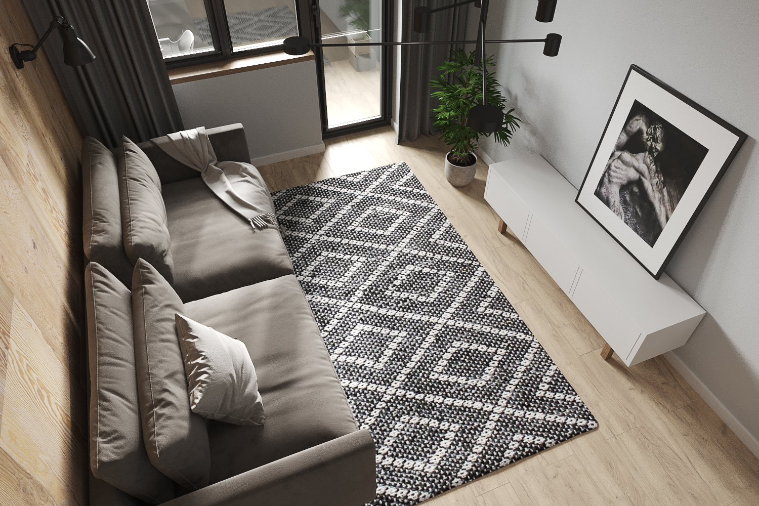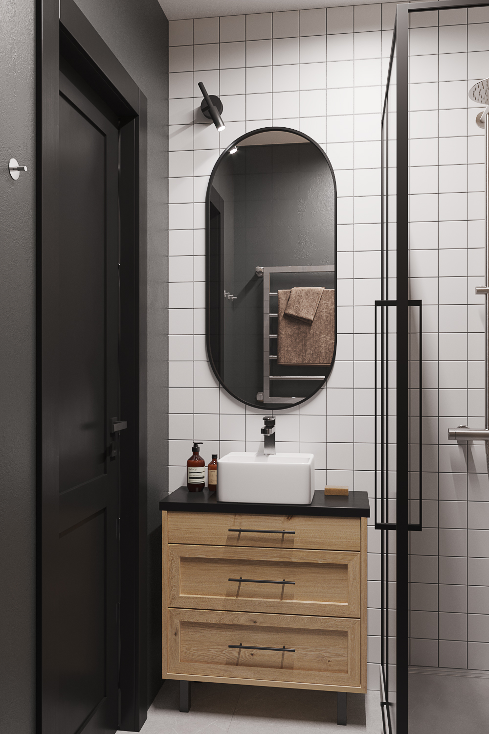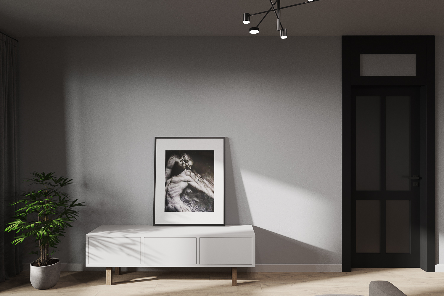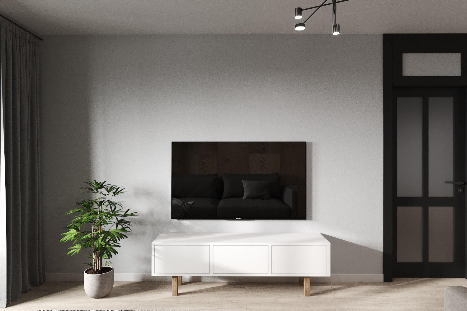 Главным акцентом стали черные двери с фальш фрамугами в потолок.