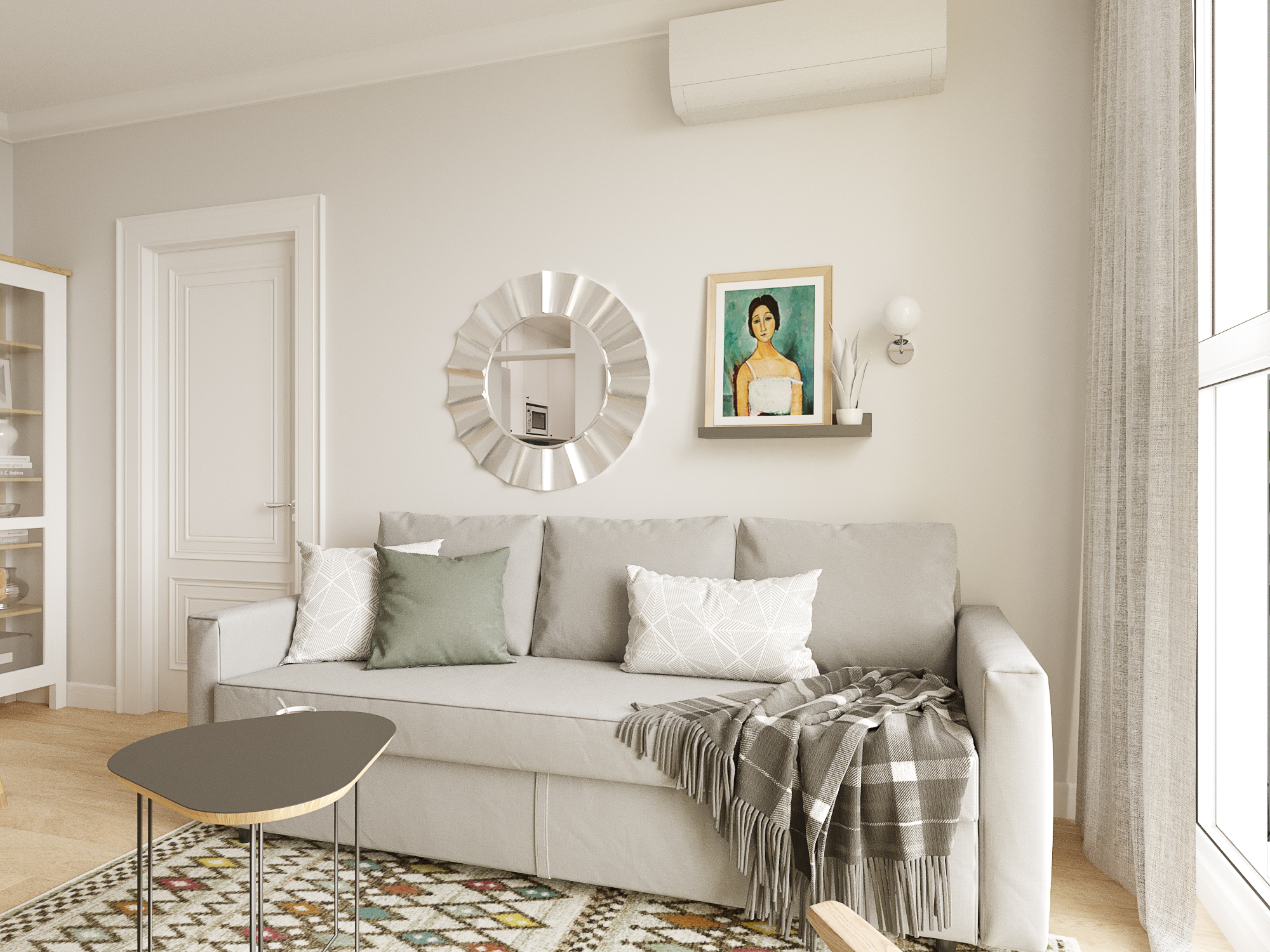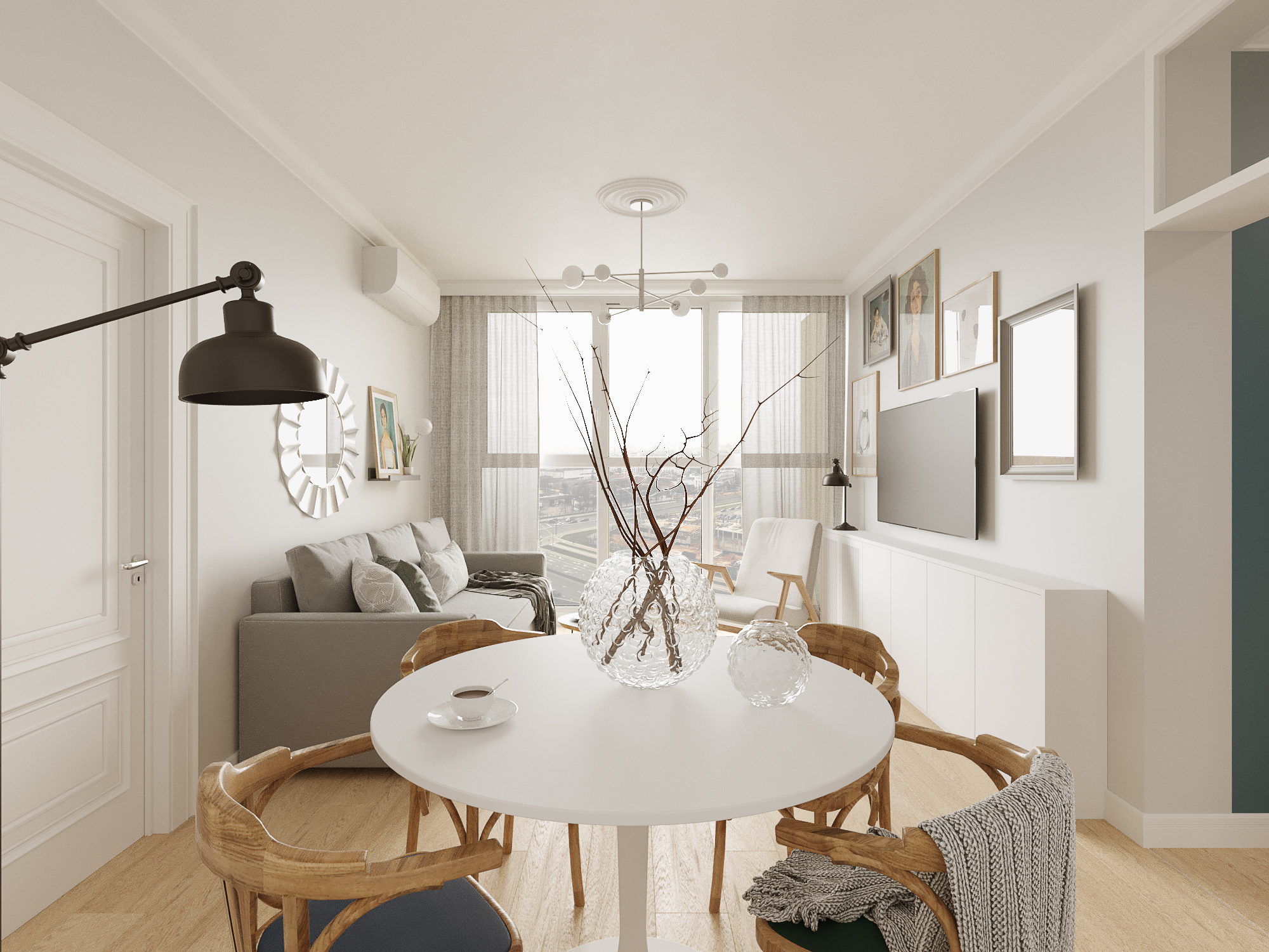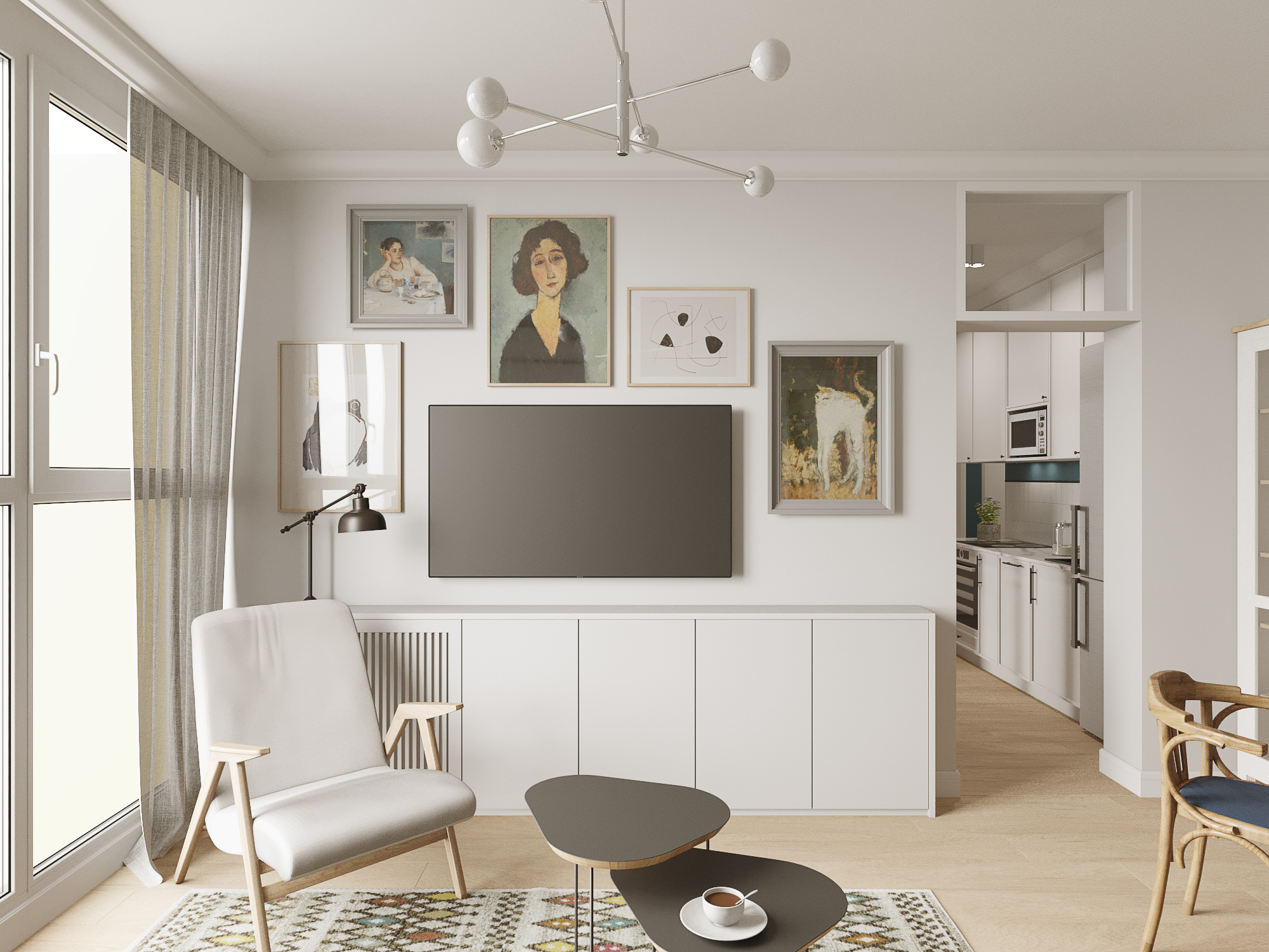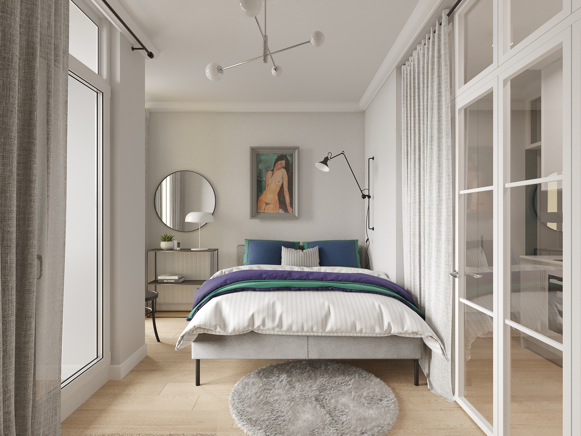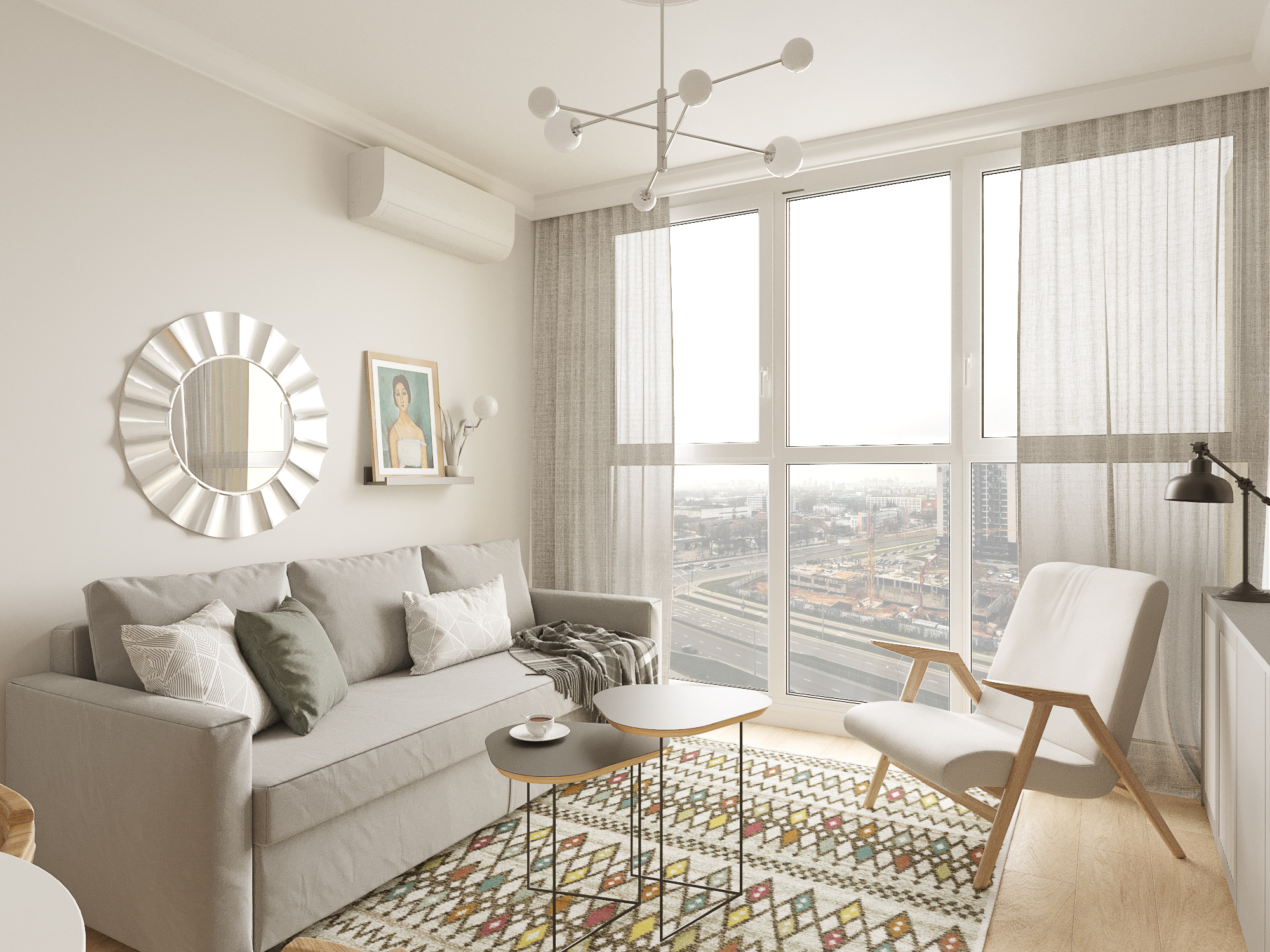 Стиль — модернизм с элементами mid-century. Спокойные в целом тона соседствуют с яркими акцентными. Мебель преимущественно на ножках, что делает комнаты визуально больше.