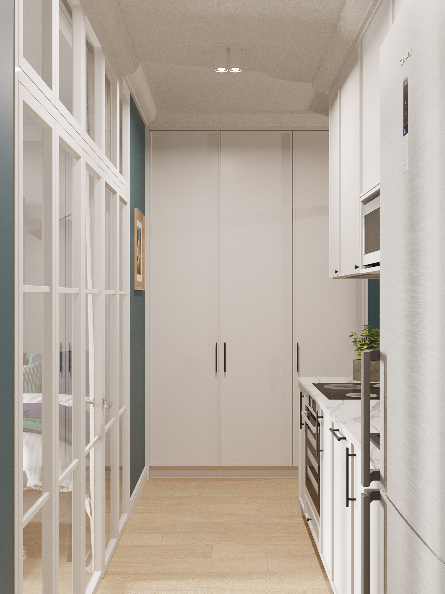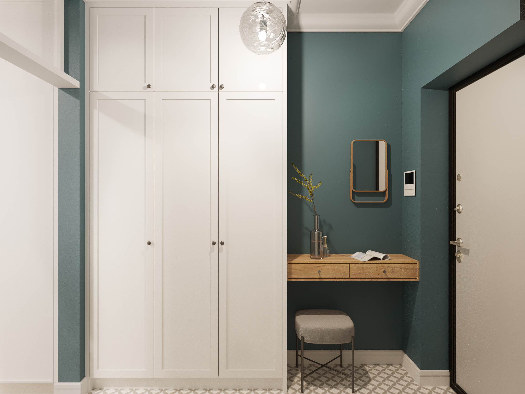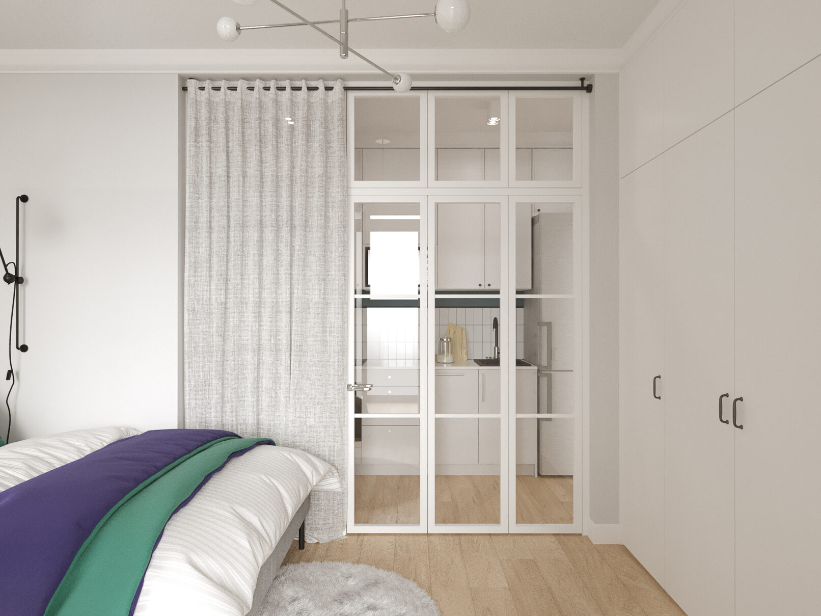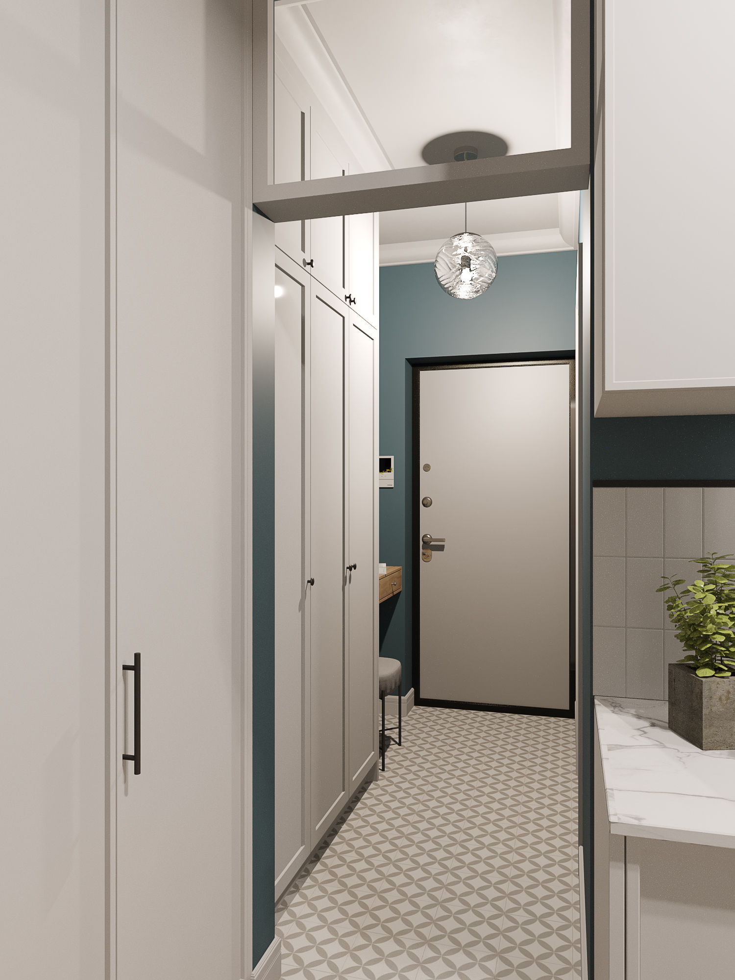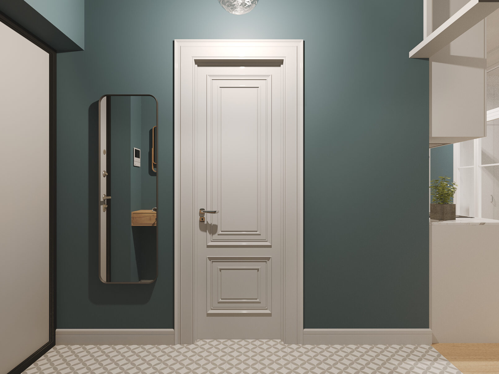 Проект квартиры в новостройке. Заказчики — молодая семья с двумя детьми. С помощью перепланировки мы организовали прихожую, отдельную проходную кухню, гостиную со столовой, спальню для родителей, детскую и совмещенный санузел.