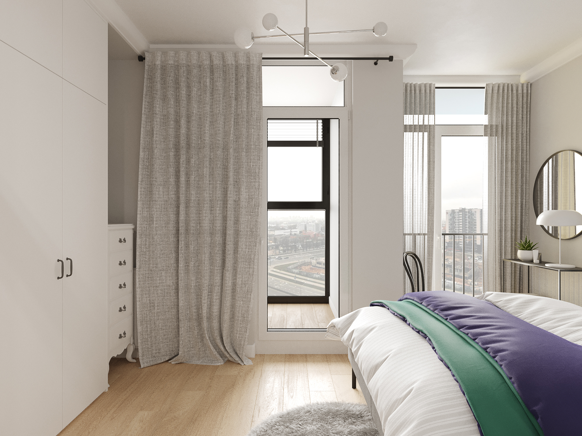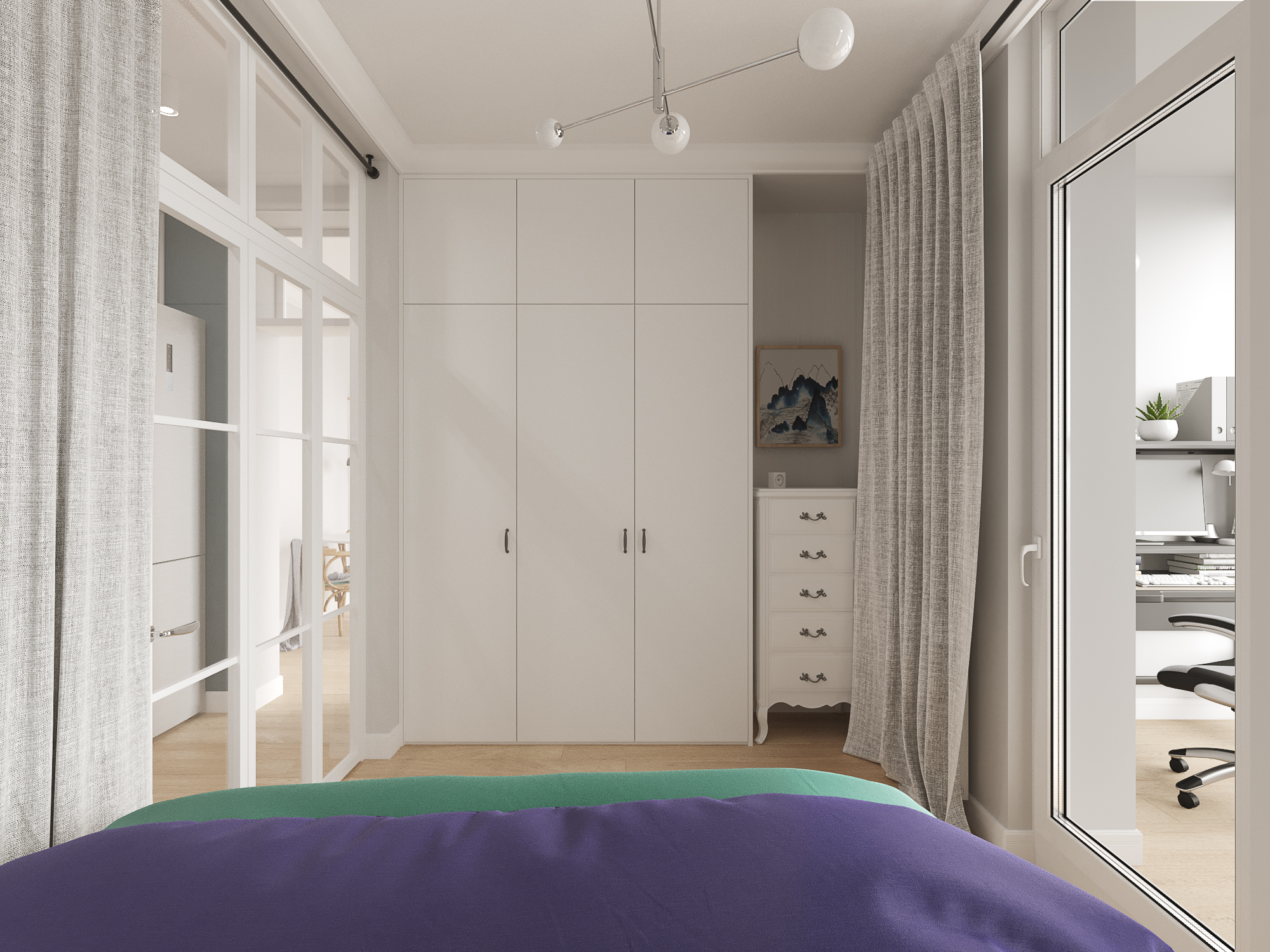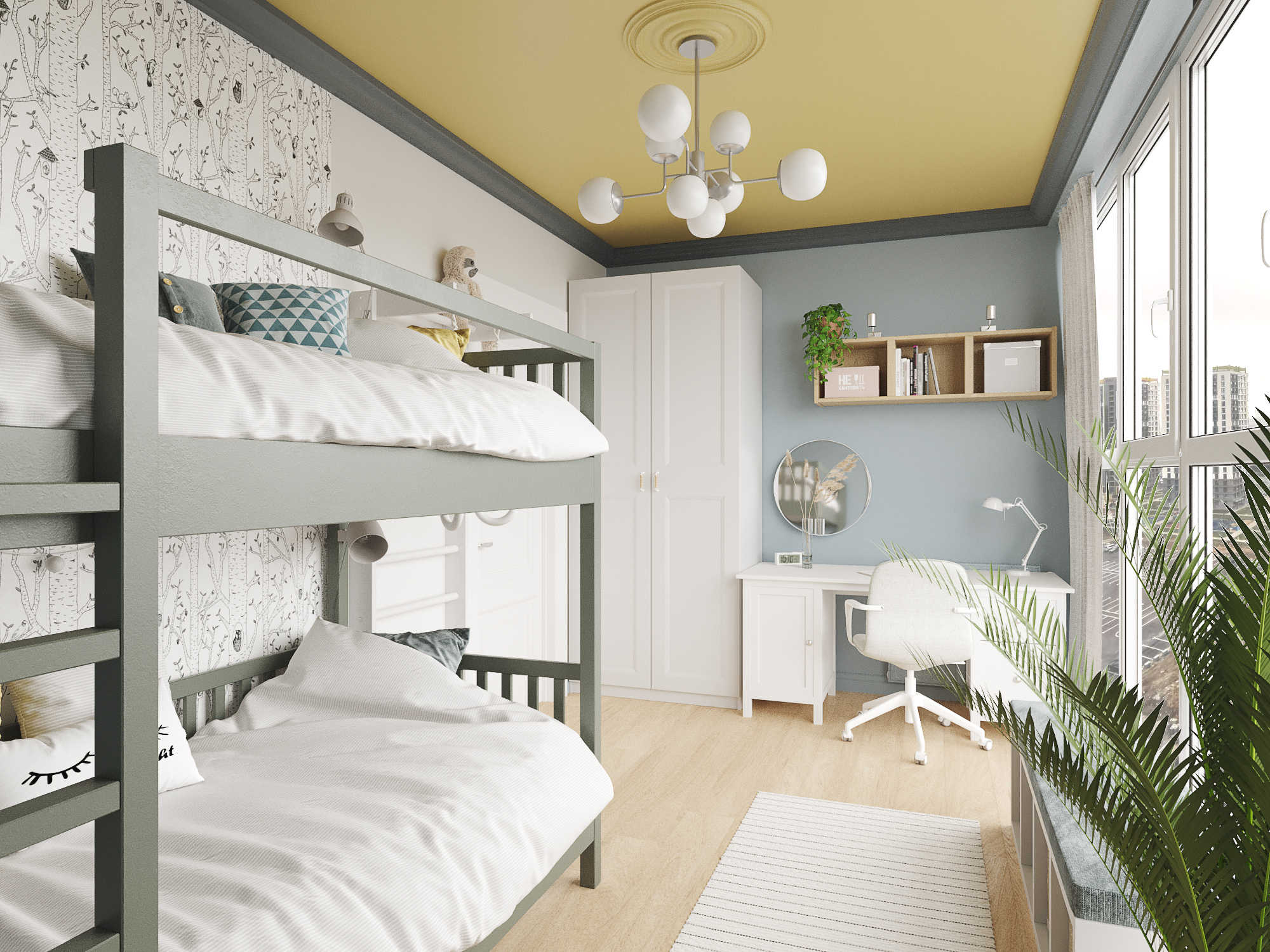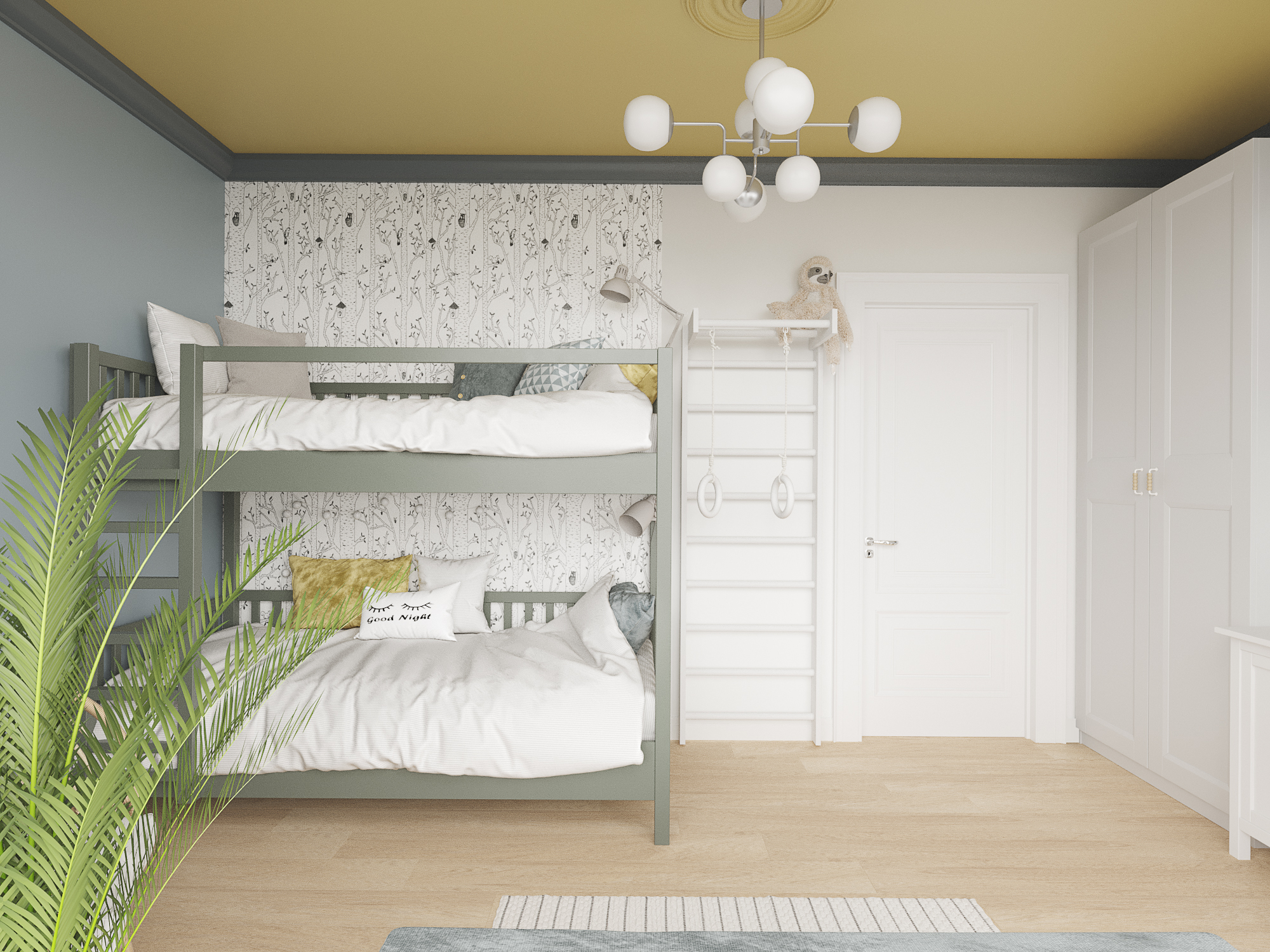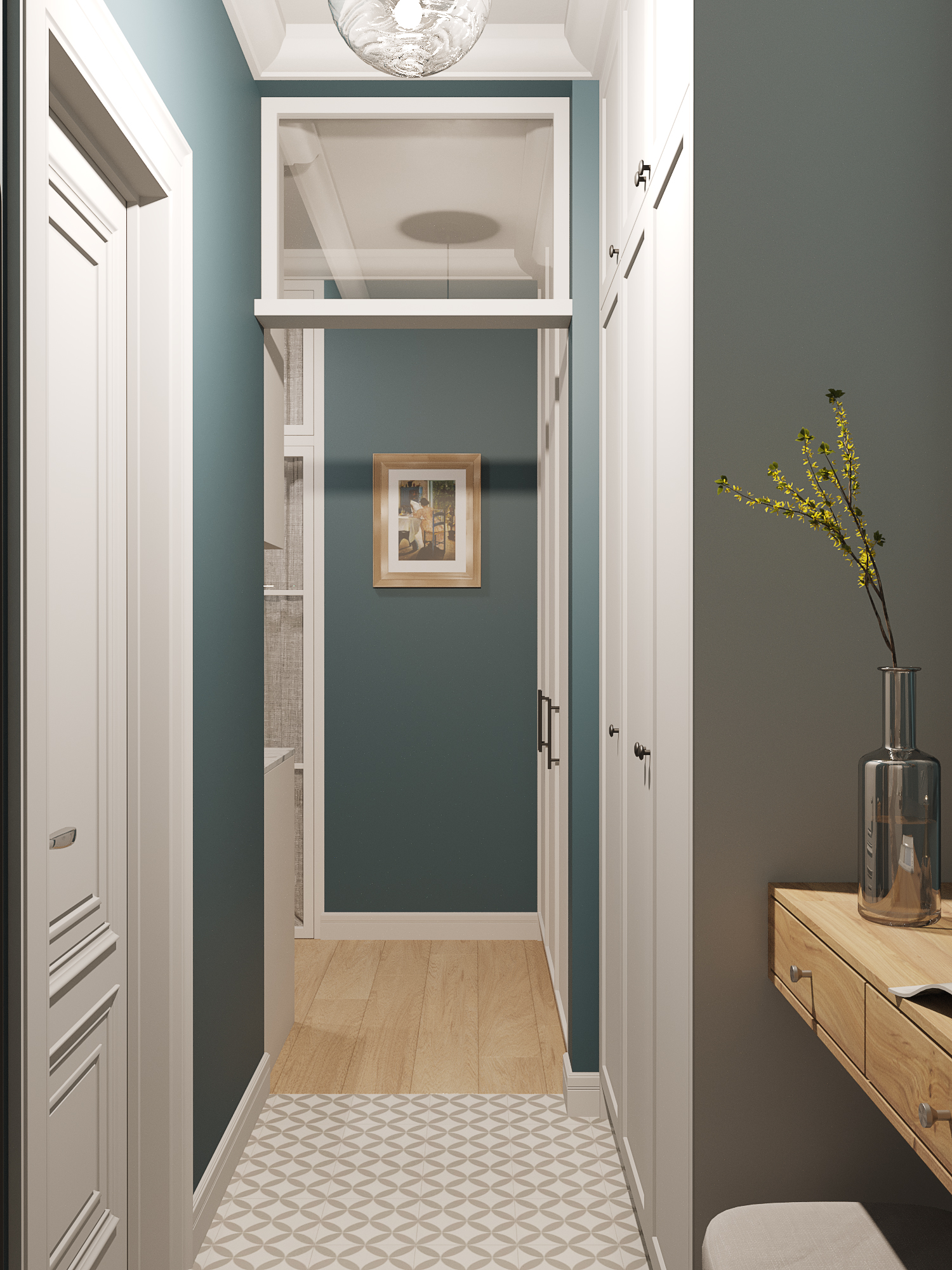 Проект квартиры в новостройке. Заказчики — молодая семья с двумя детьми. С помощью перепланировки мы организовали прихожую, отдельную проходную кухню, гостиную со столовой, спальню для родителей, детскую и совмещенный санузел.