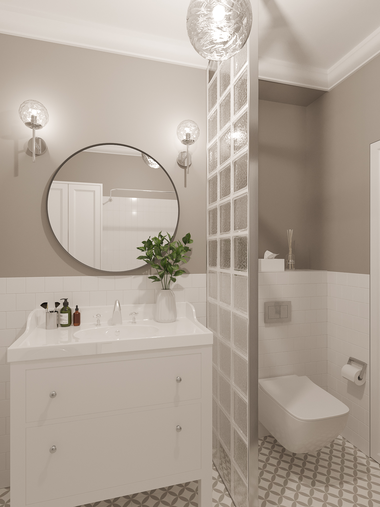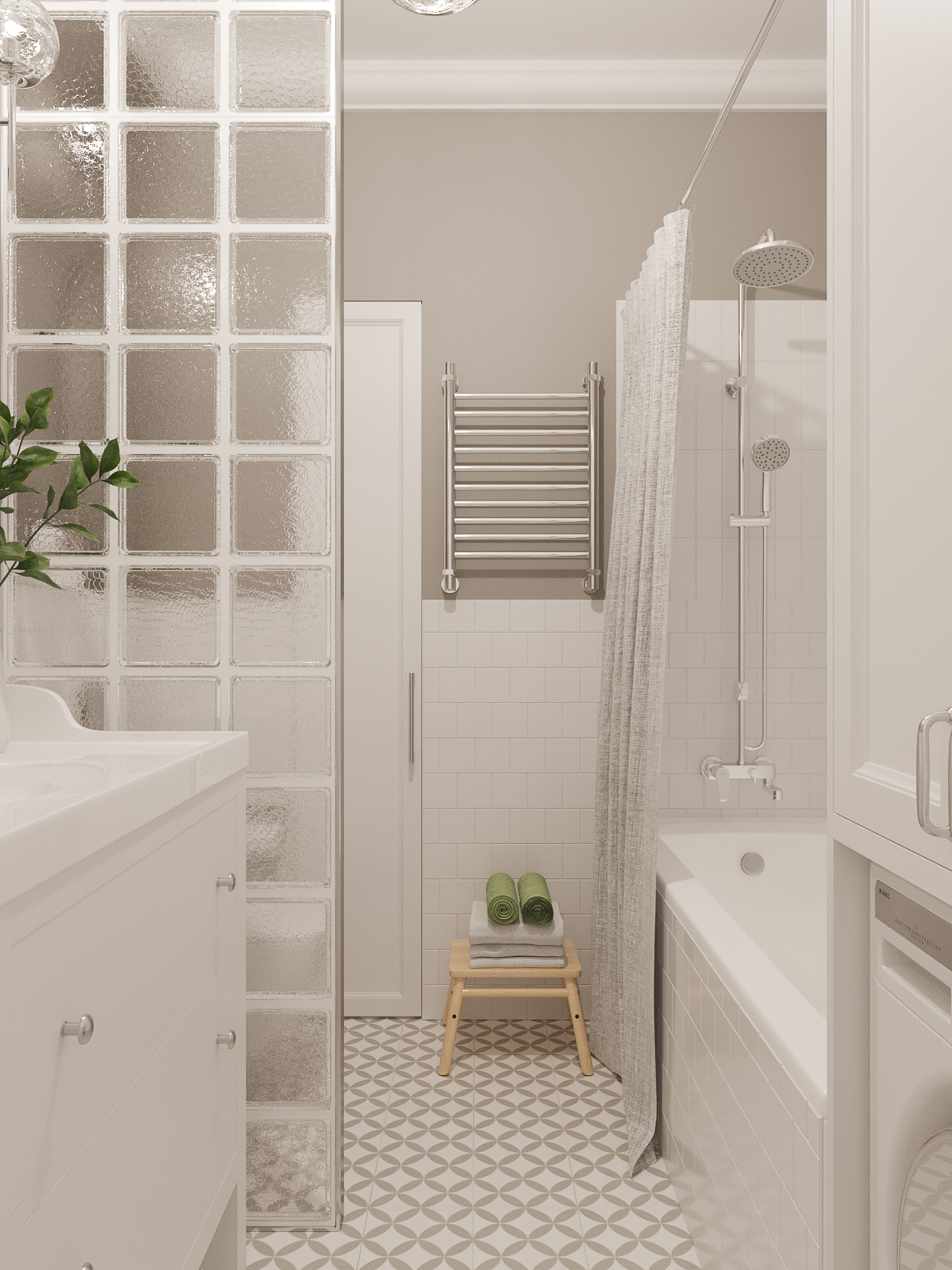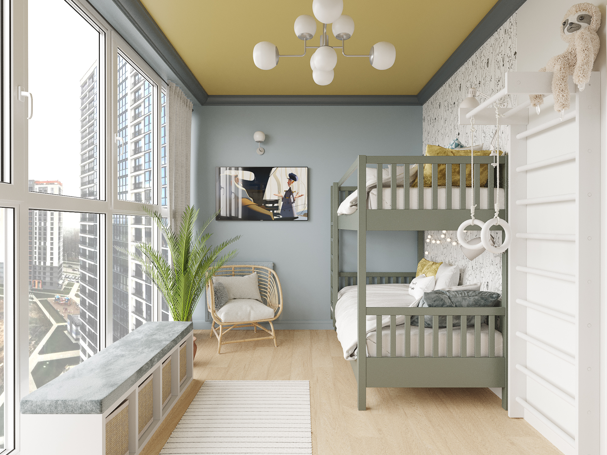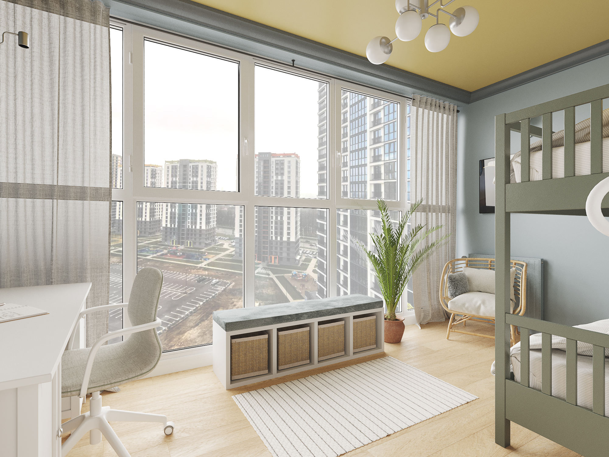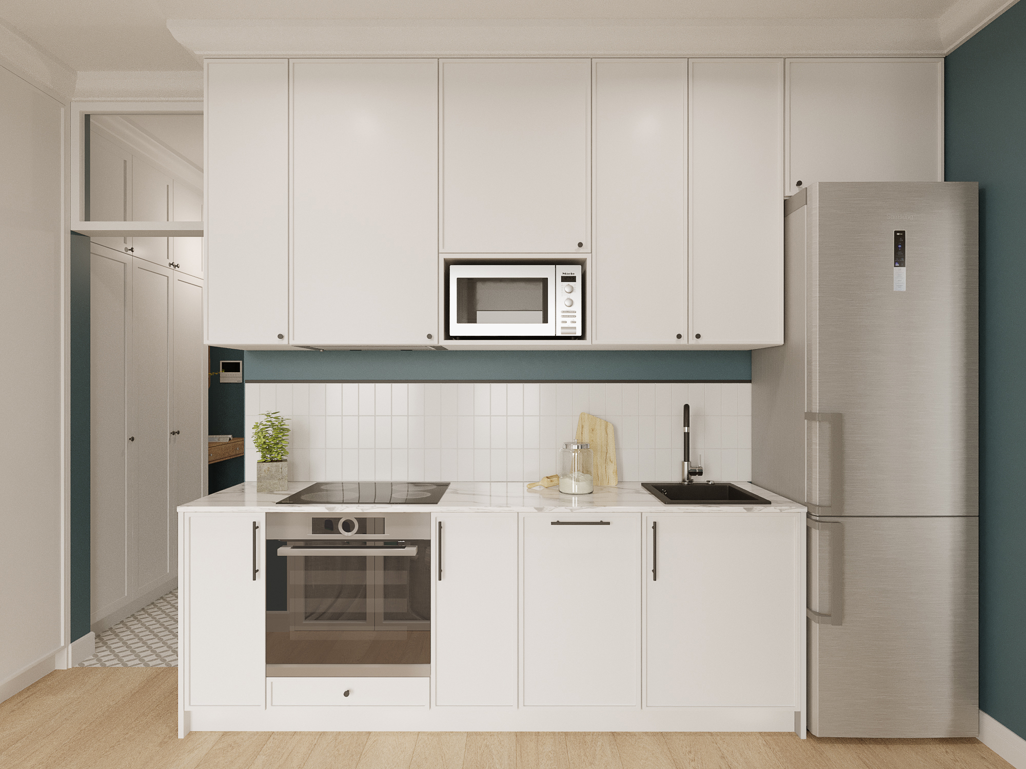 Проект квартиры в новостройке. Заказчики — молодая семья с двумя детьми. С помощью перепланировки мы организовали прихожую, отдельную проходную кухню, гостиную со столовой, спальню для родителей, детскую и совмещенный санузел.