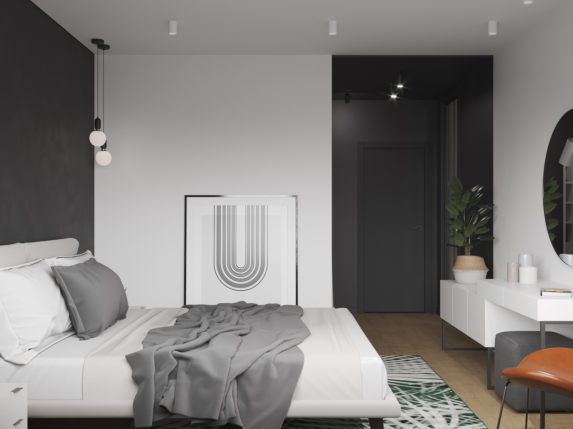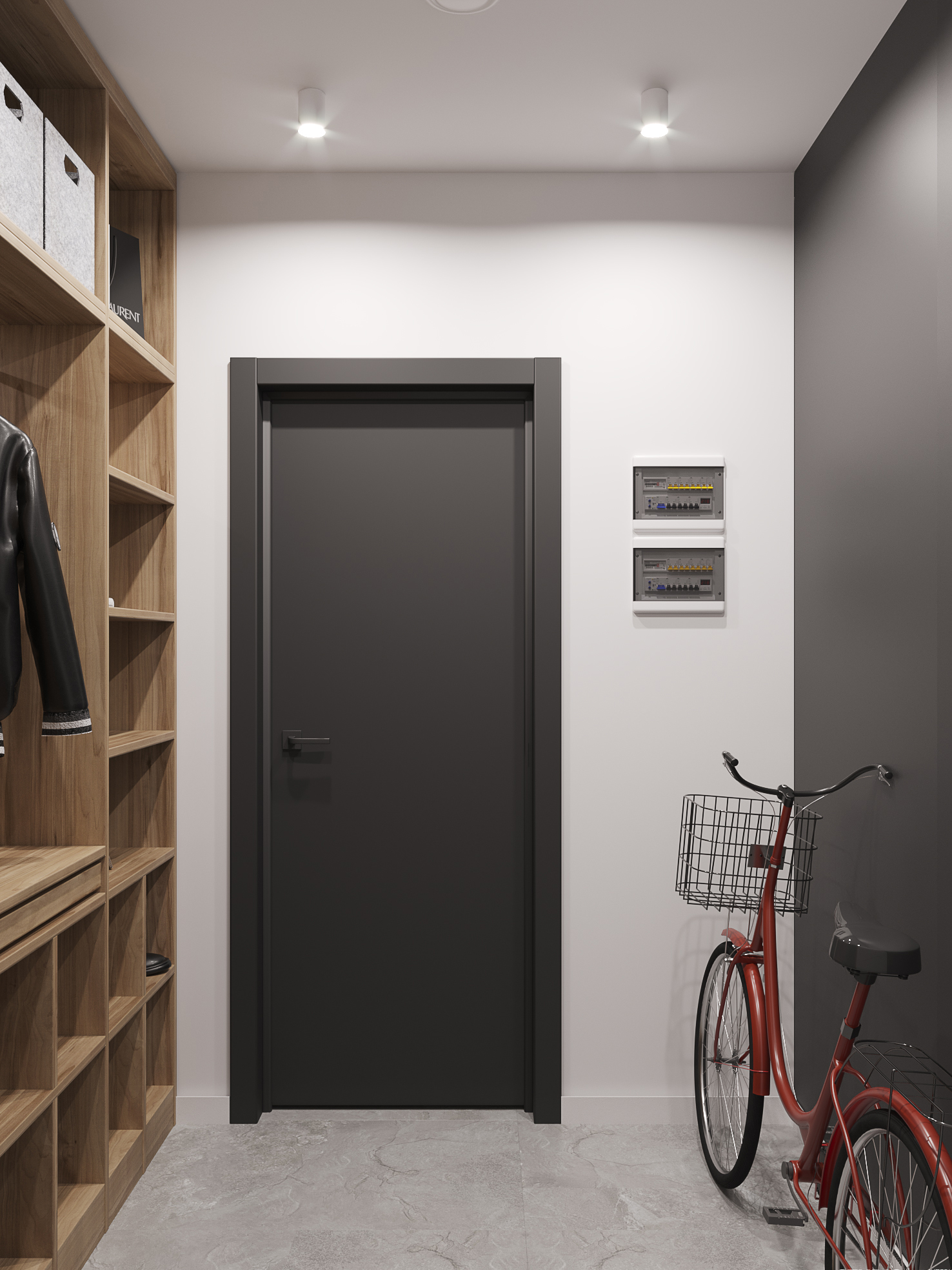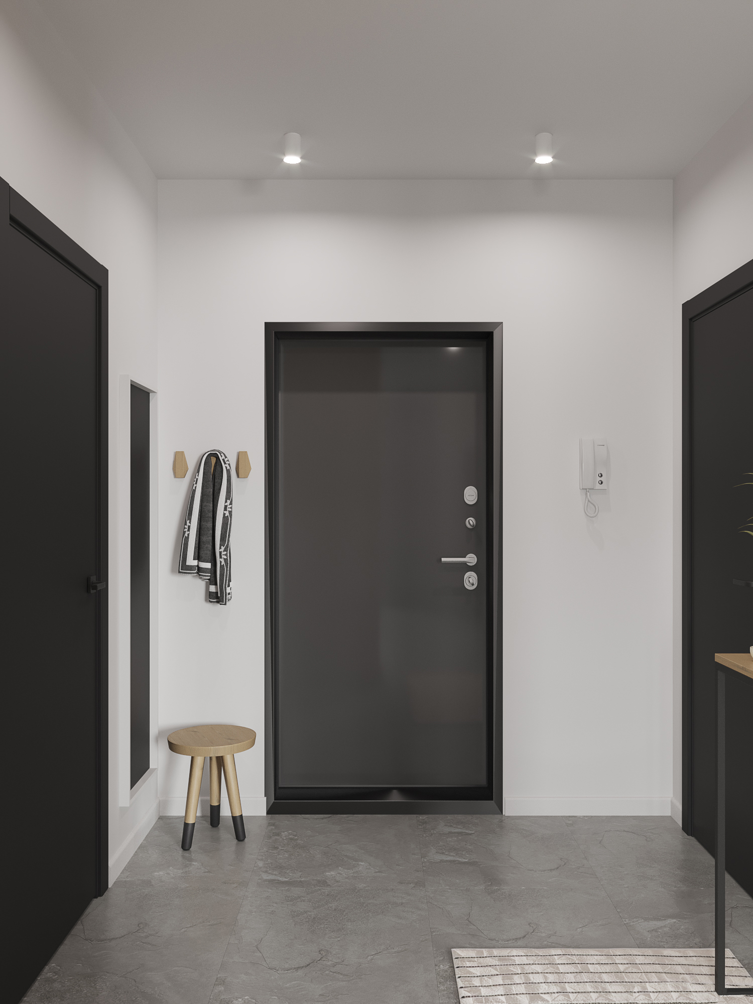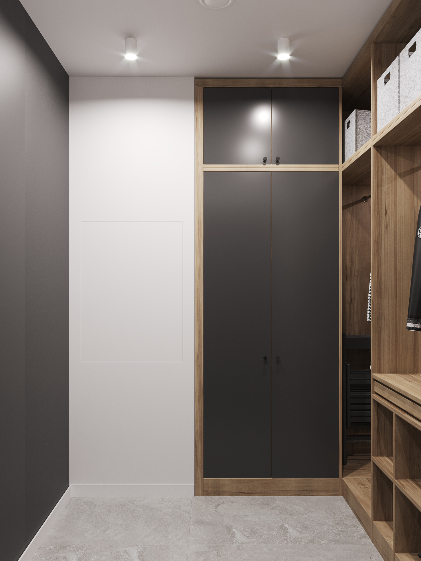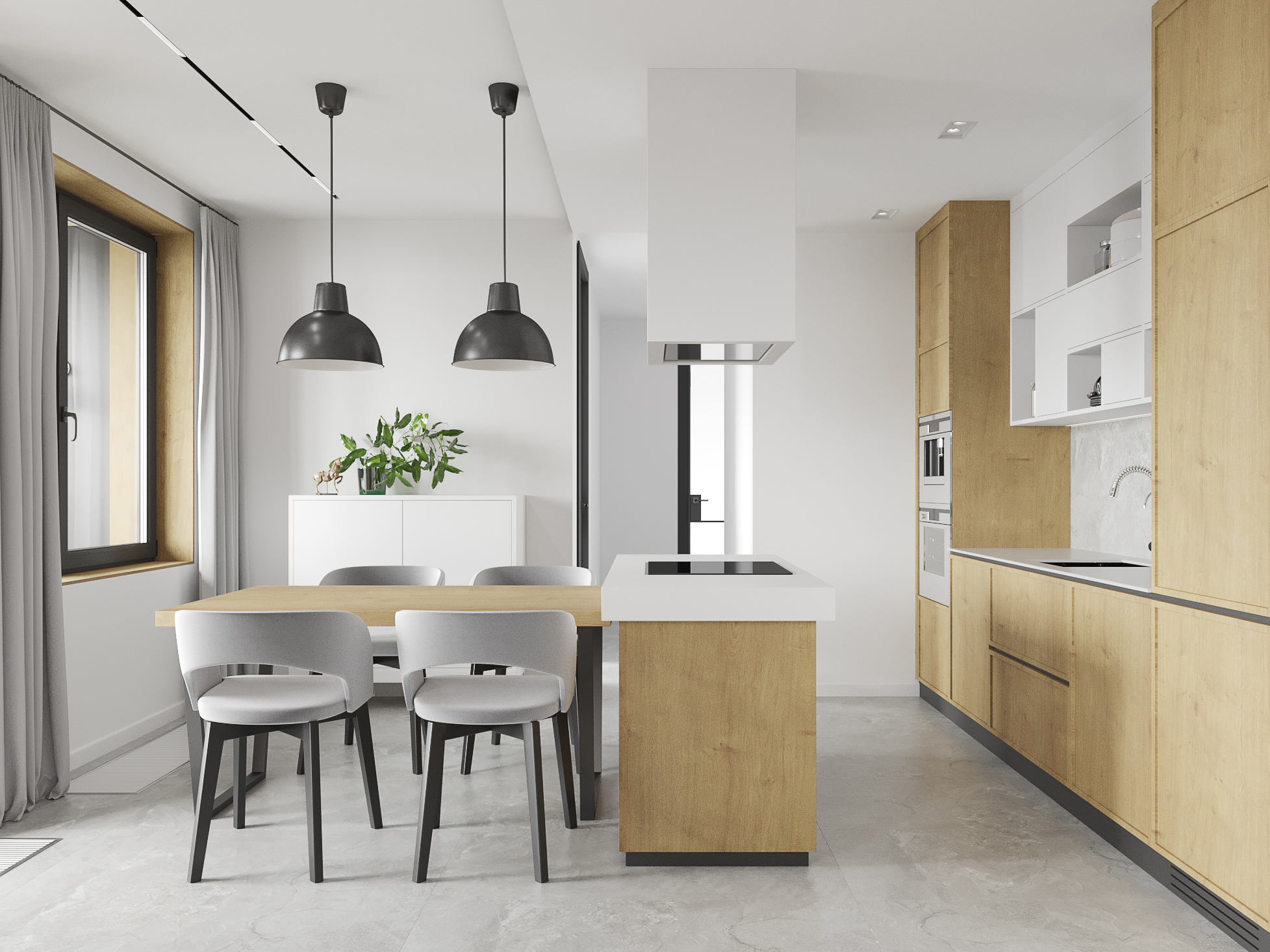 В отделке использованы светлые оттенки, цвет натурального дерева и графичные черные линии.