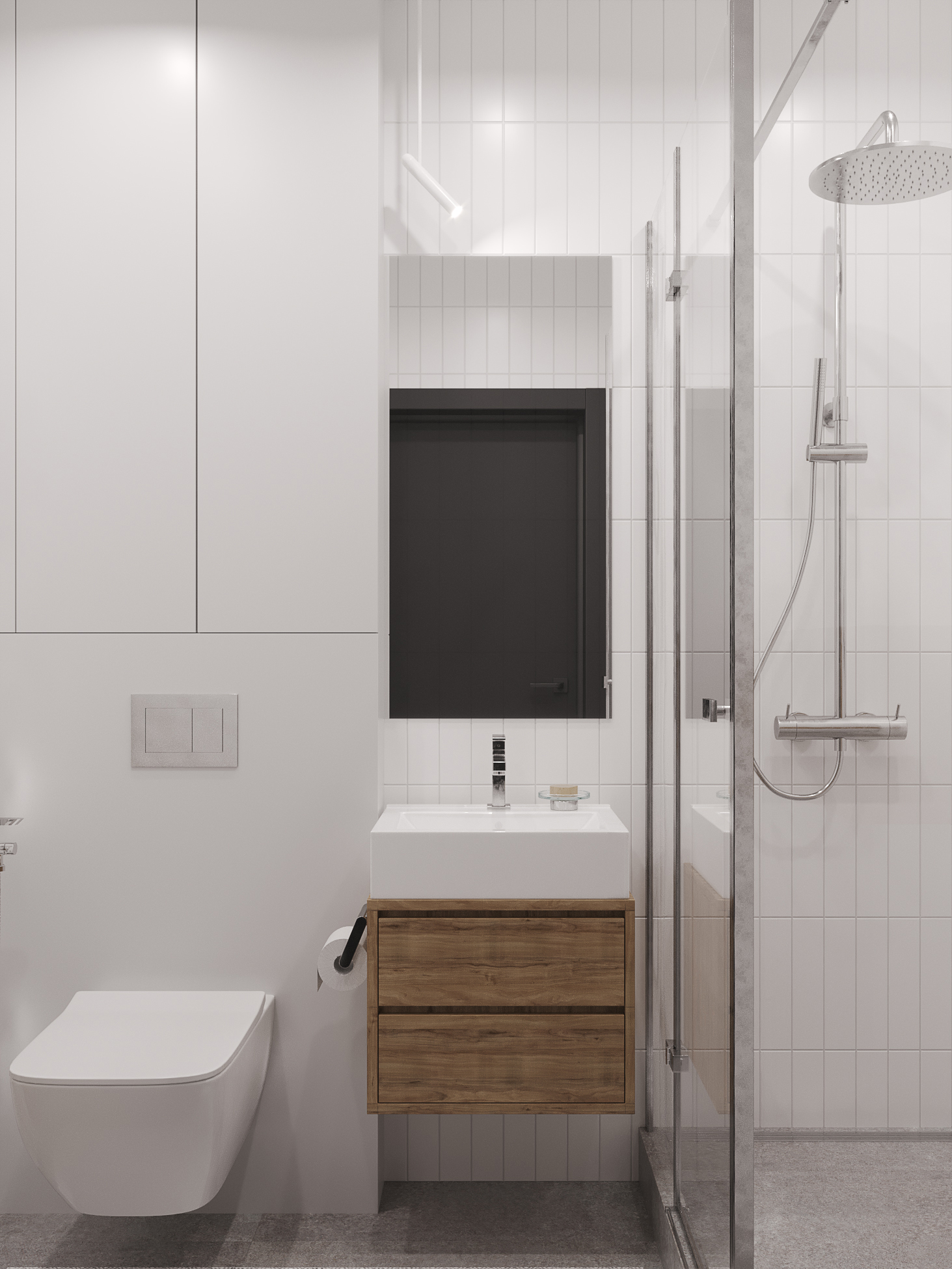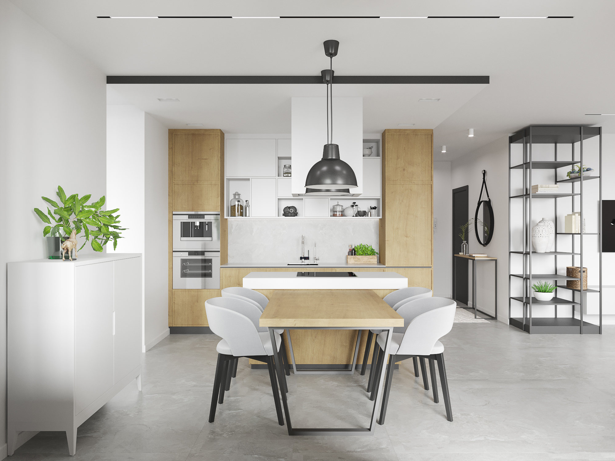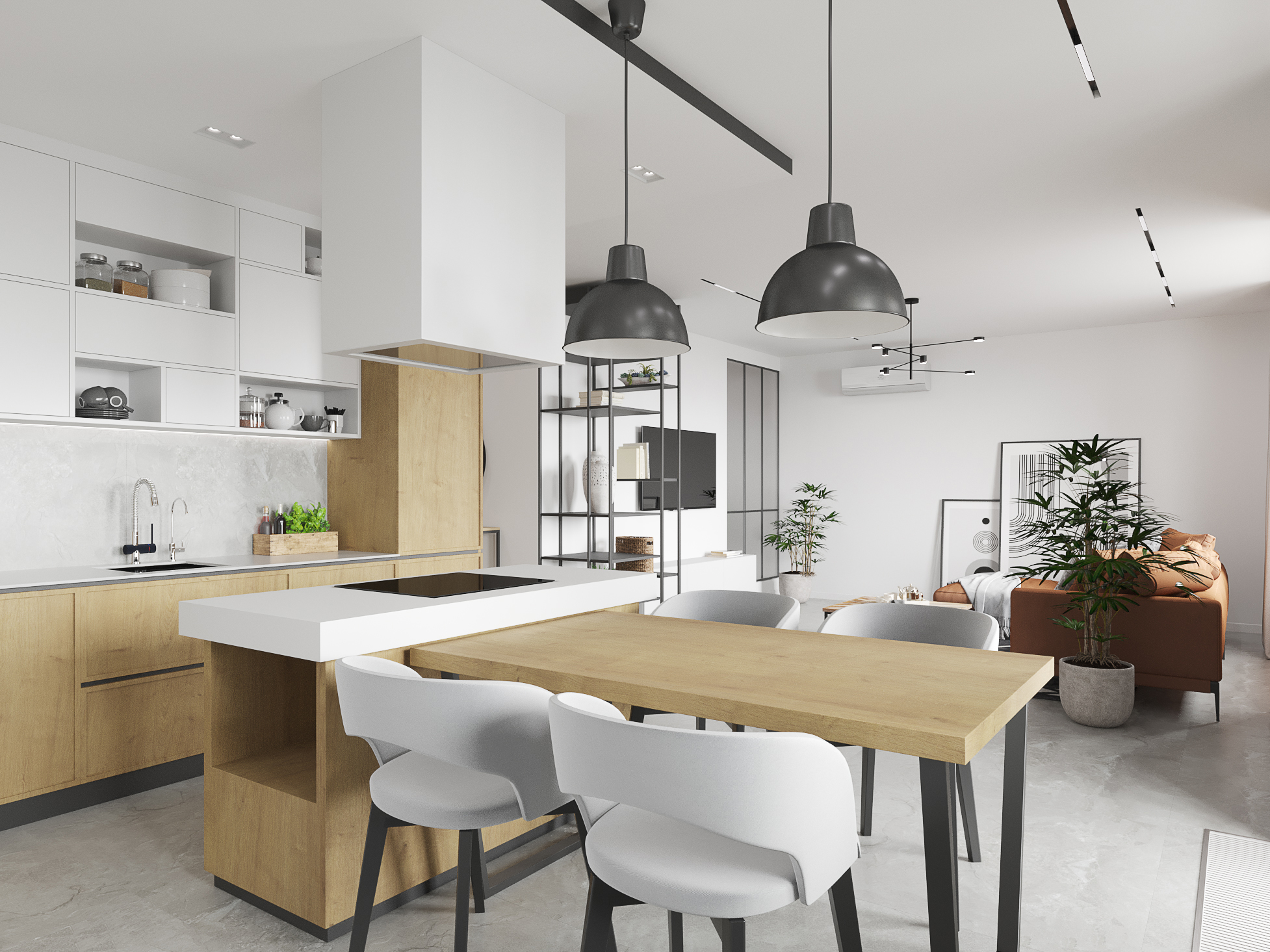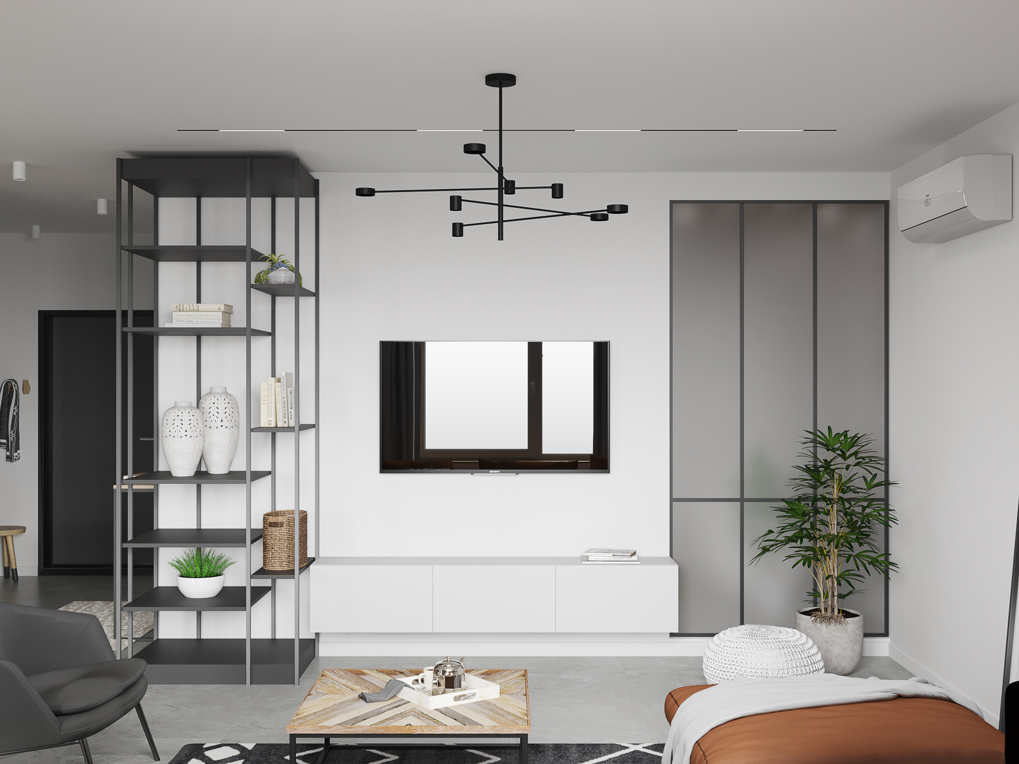 В отделке использованы светлые оттенки, цвет натурального дерева и графичные черные линии.
