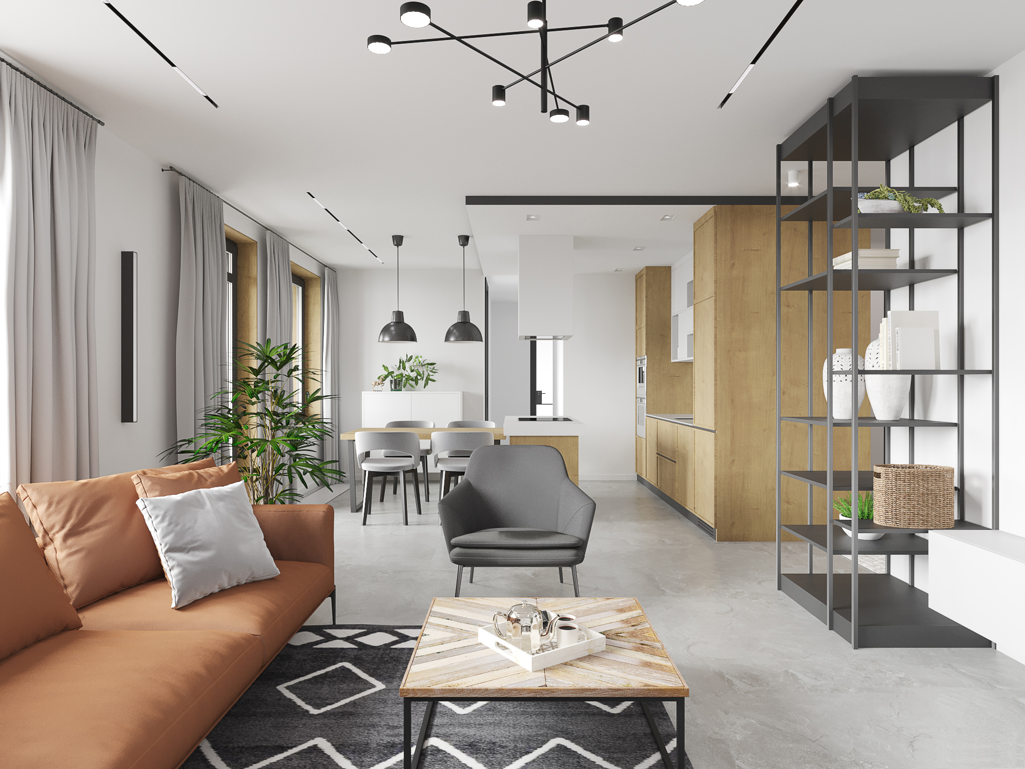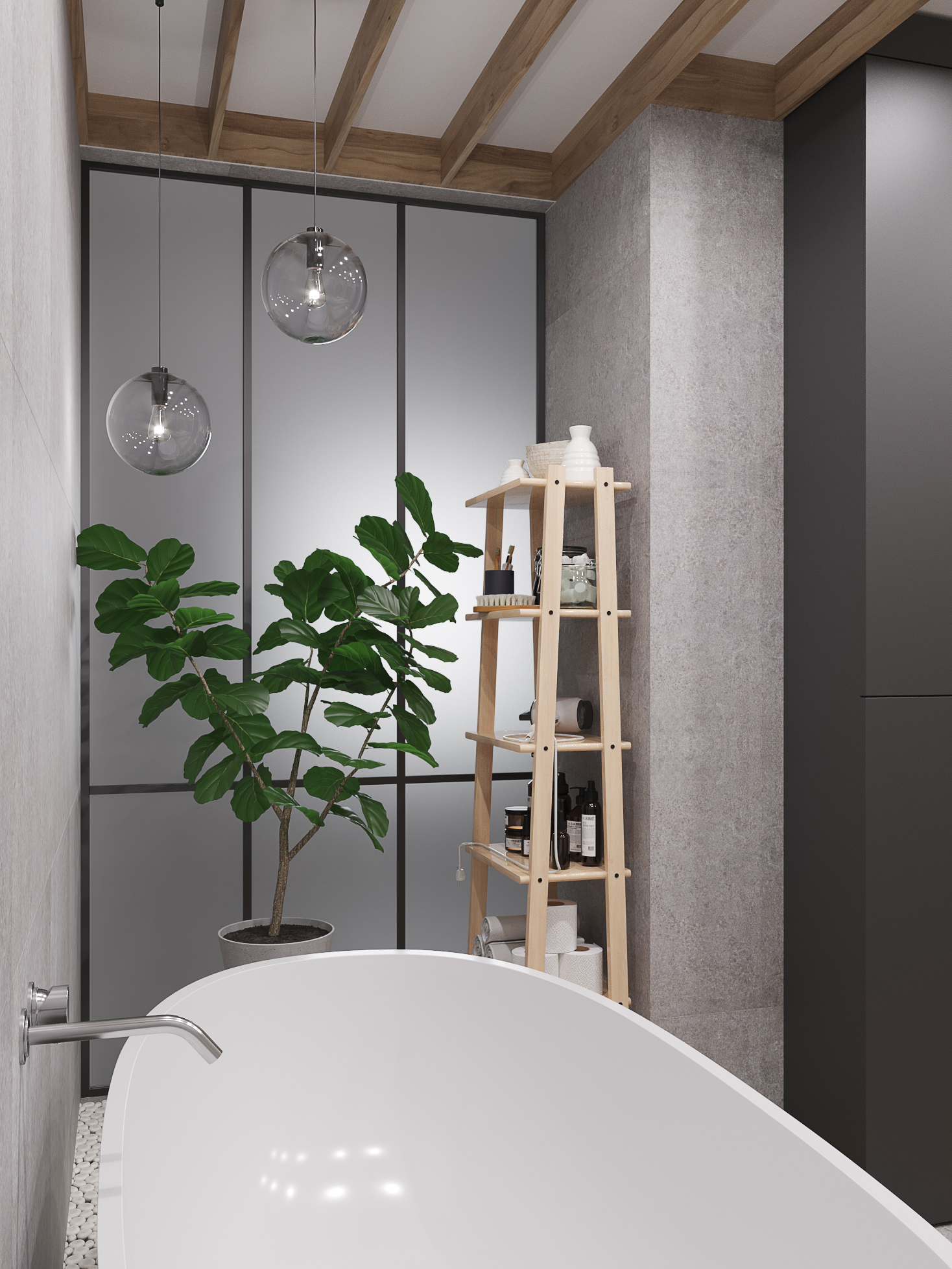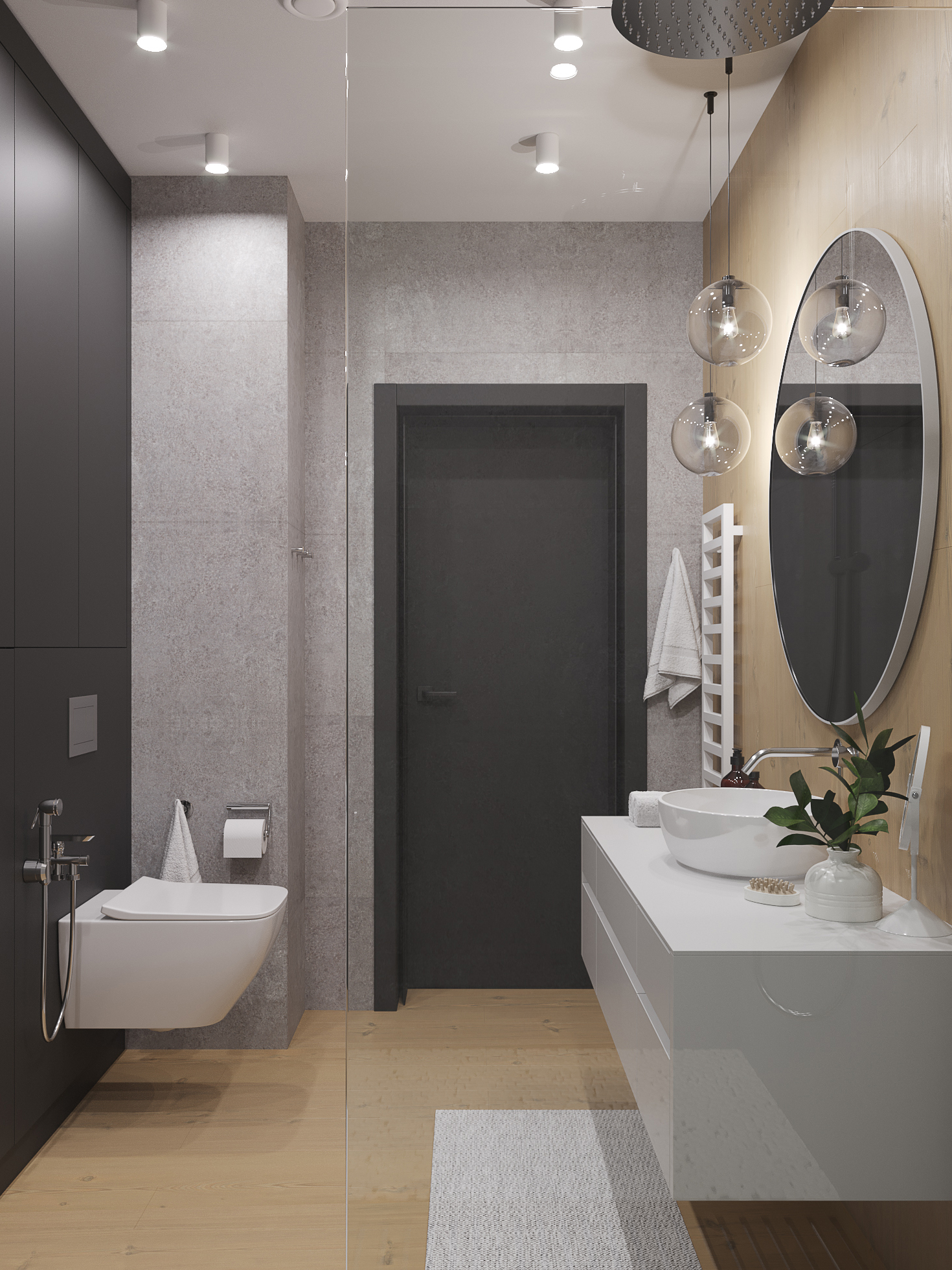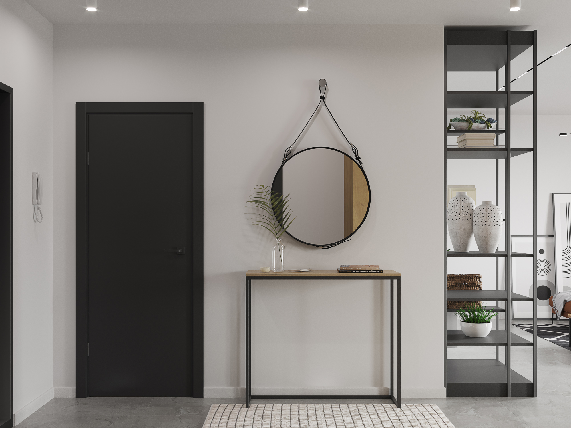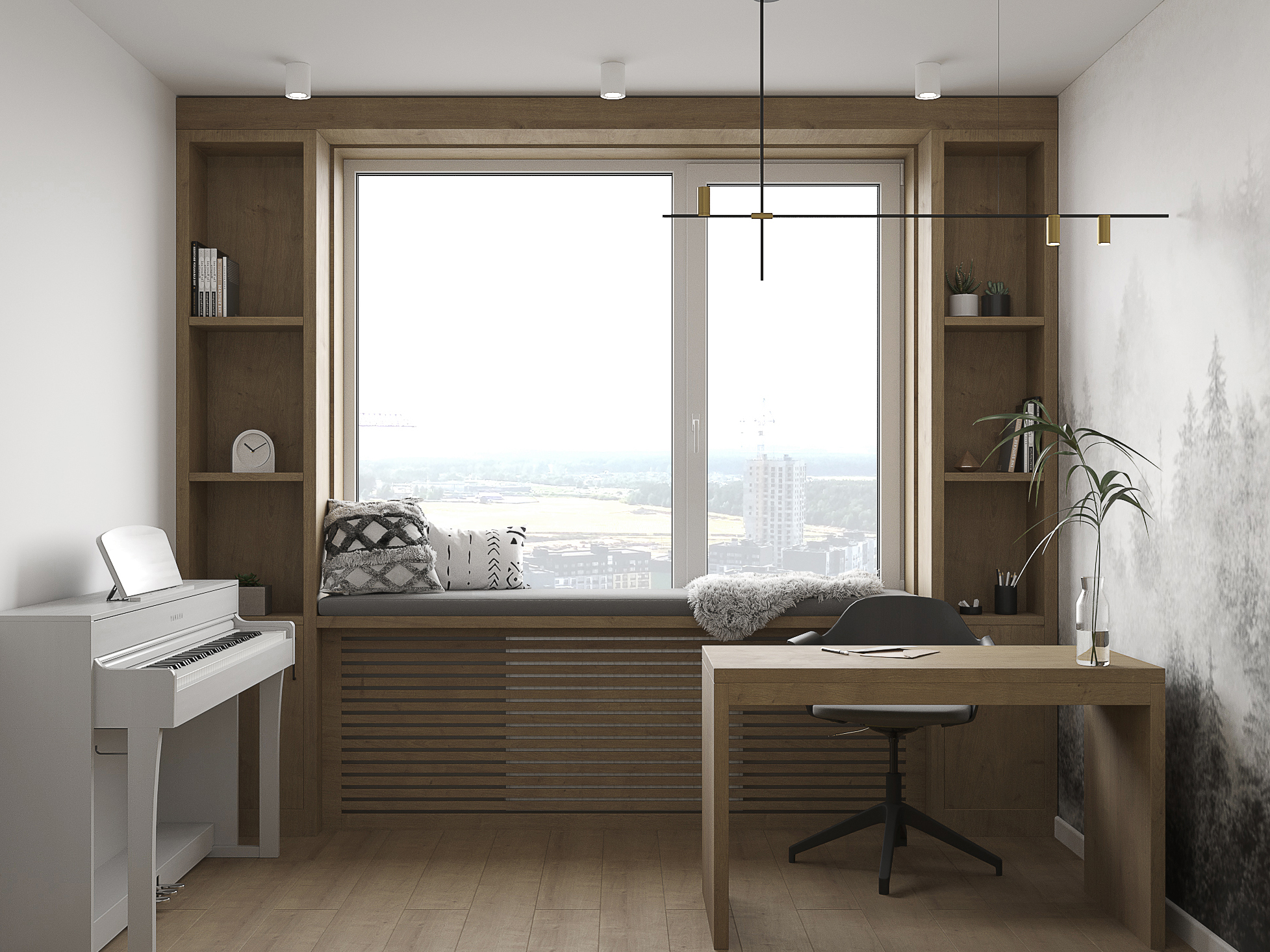 В отделке использованы светлые оттенки, цвет натурального дерева и графичные черные линии.