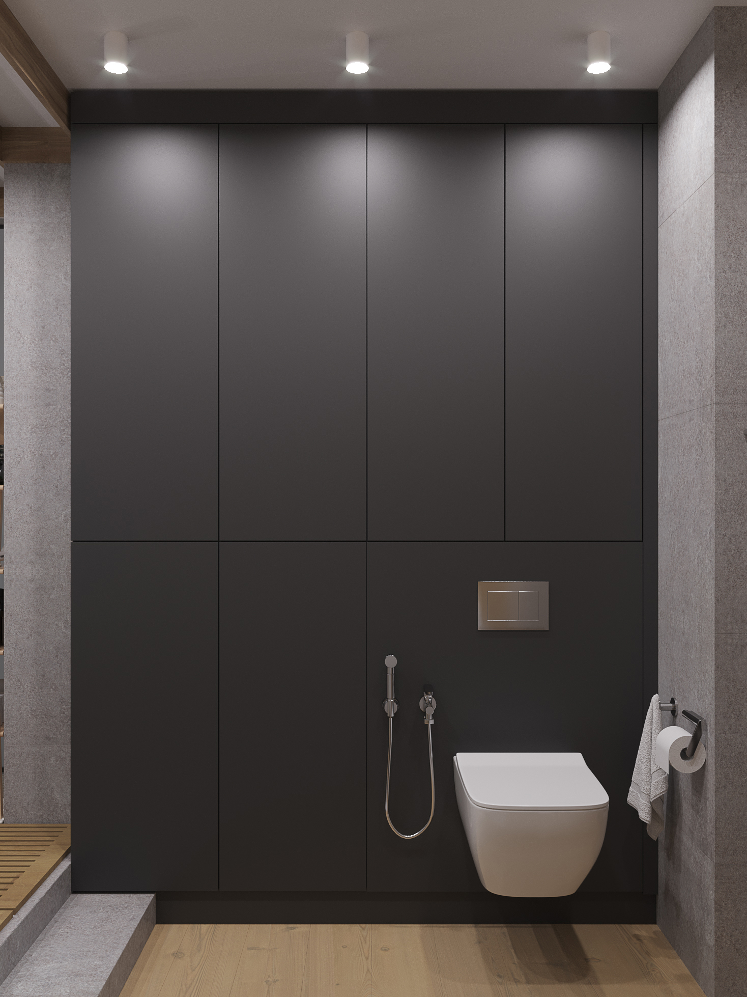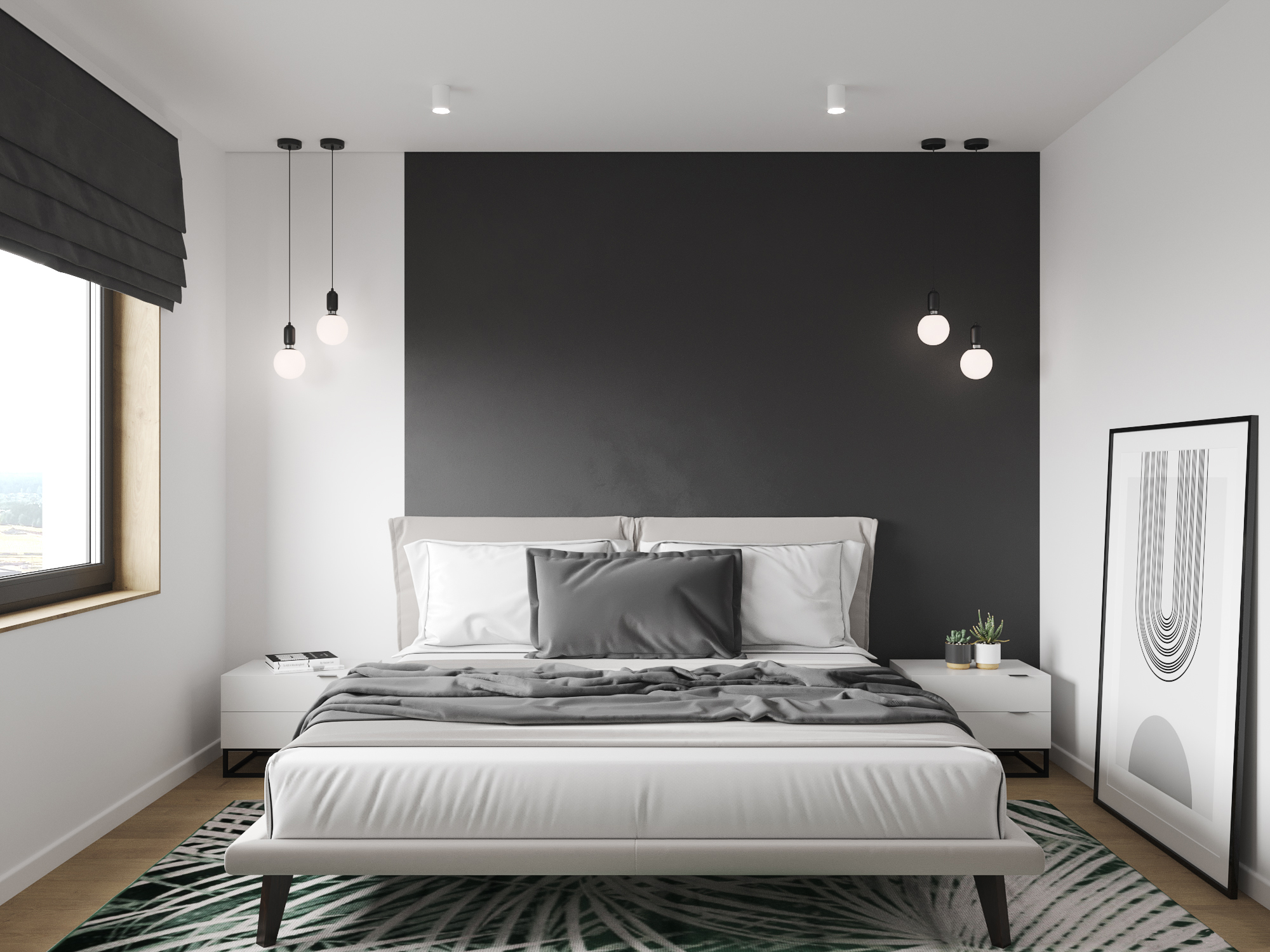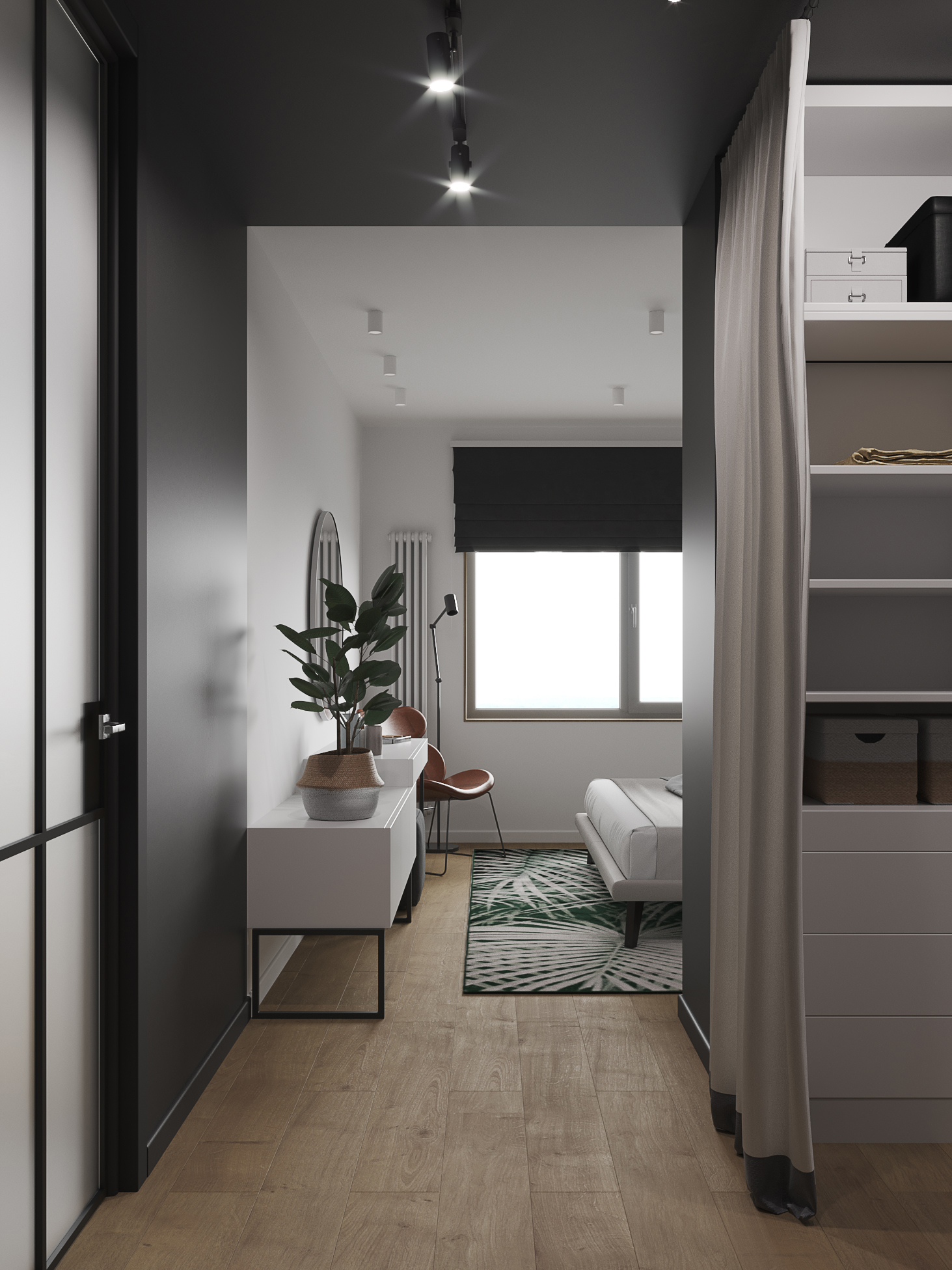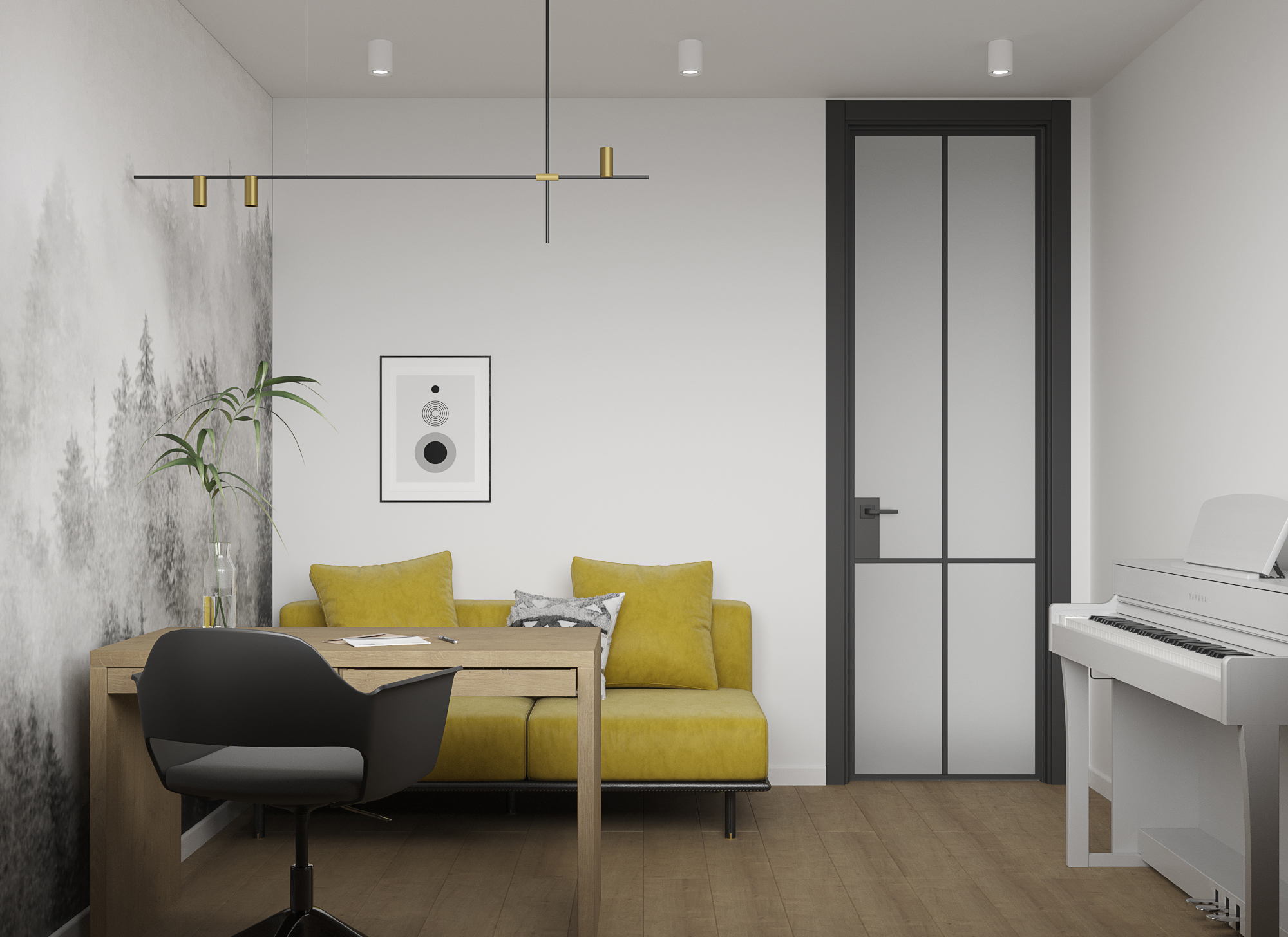 В отделке использованы светлые оттенки, цвет натурального дерева и графичные черные линии.