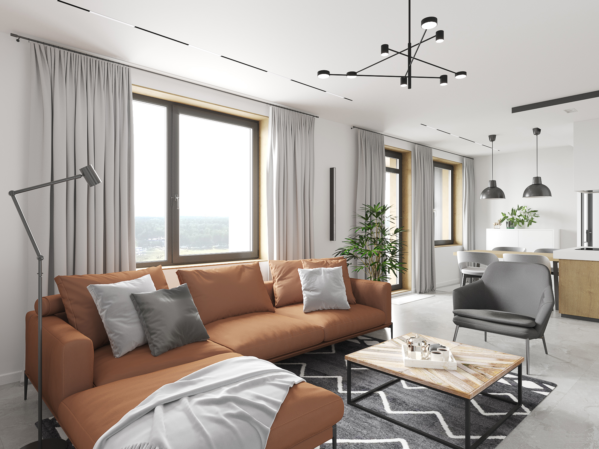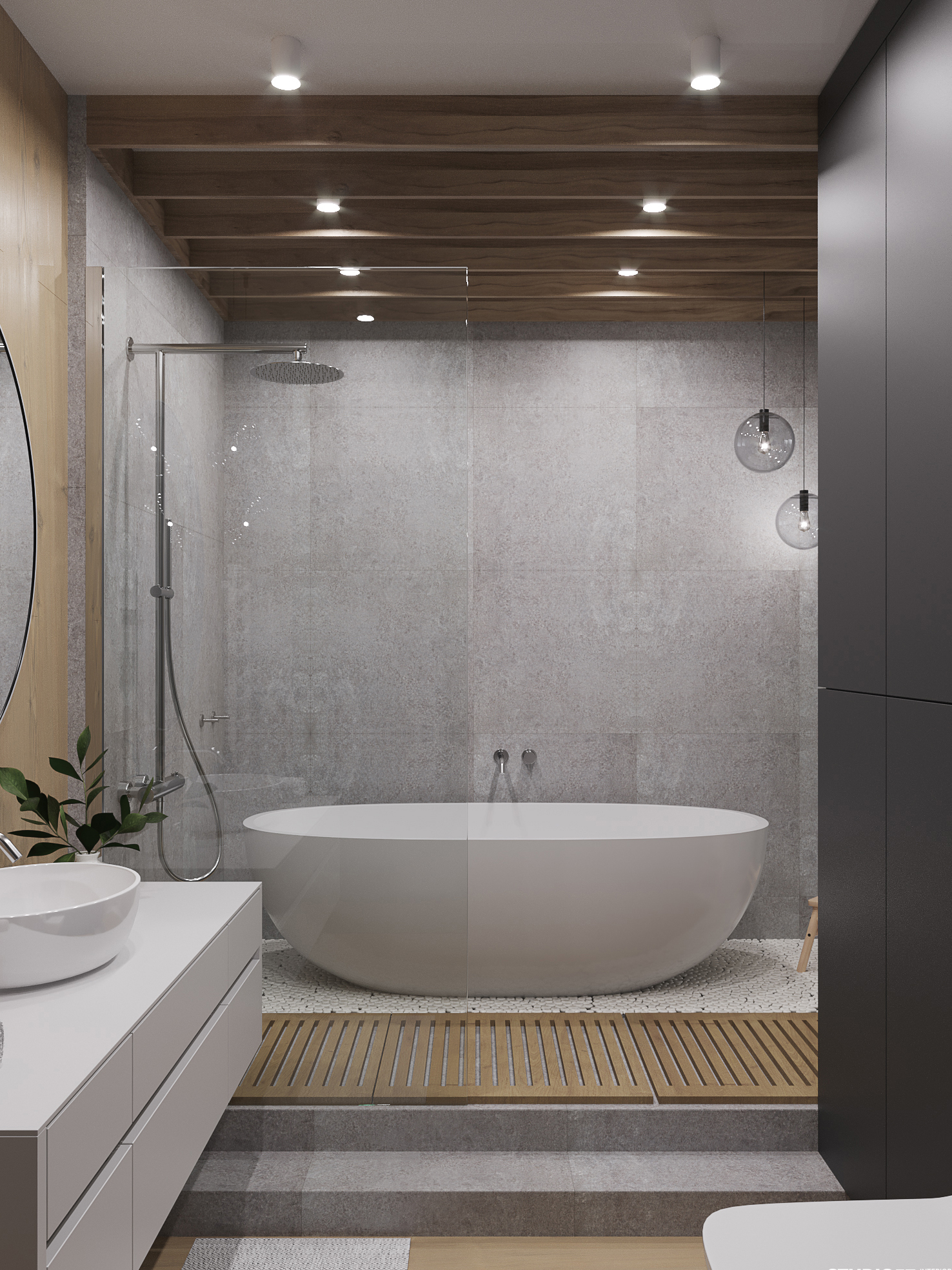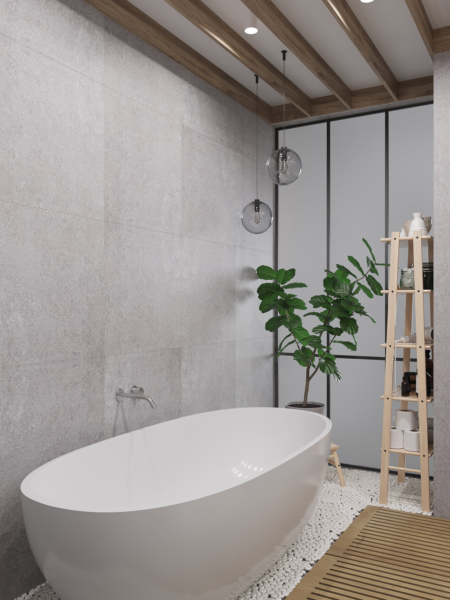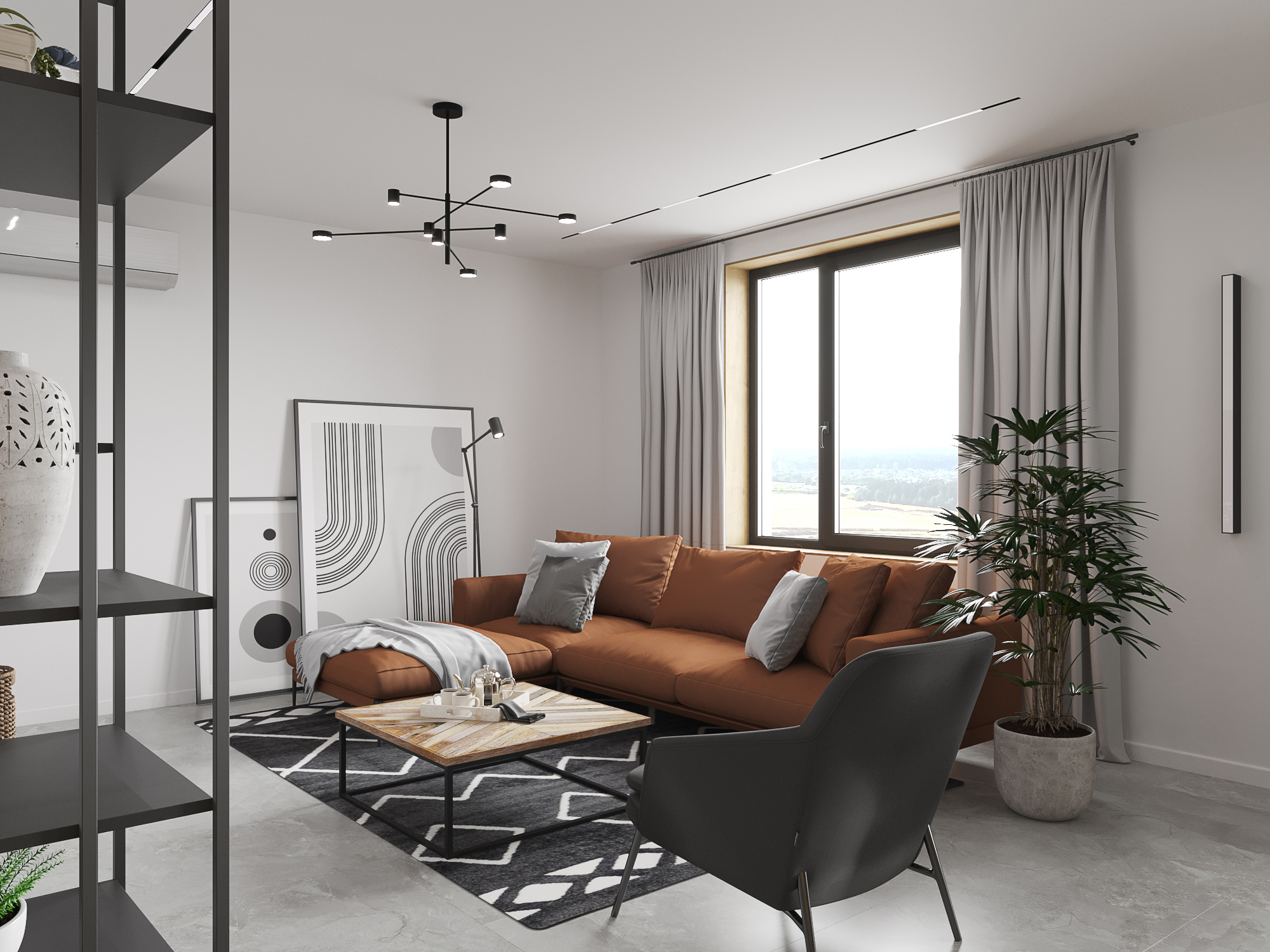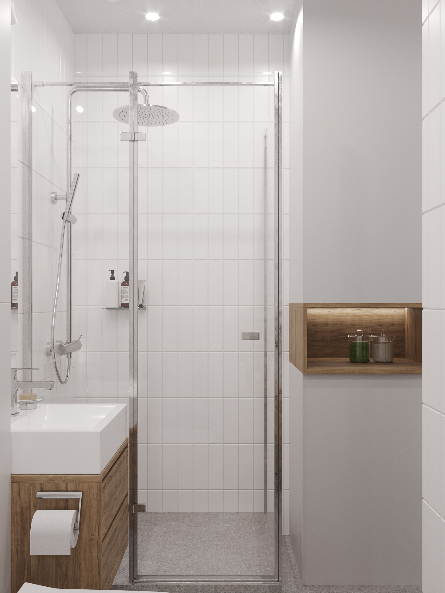 В отделке использованы светлые оттенки, цвет натурального дерева и графичные черные линии.