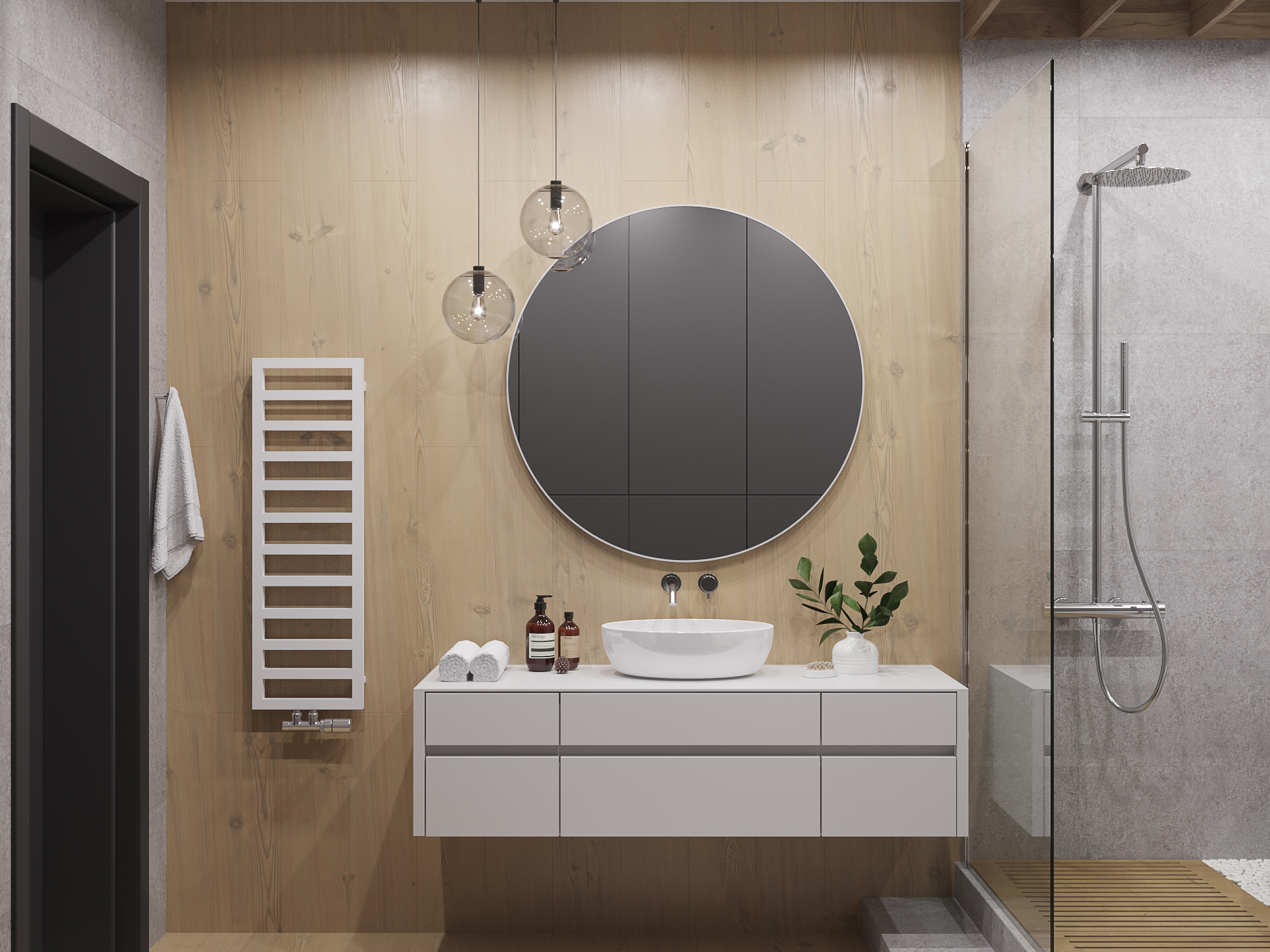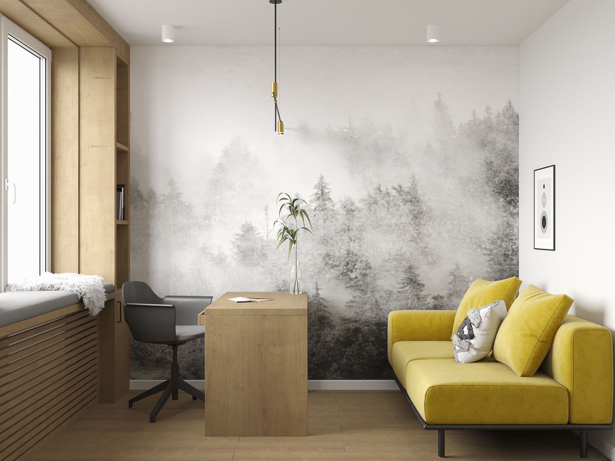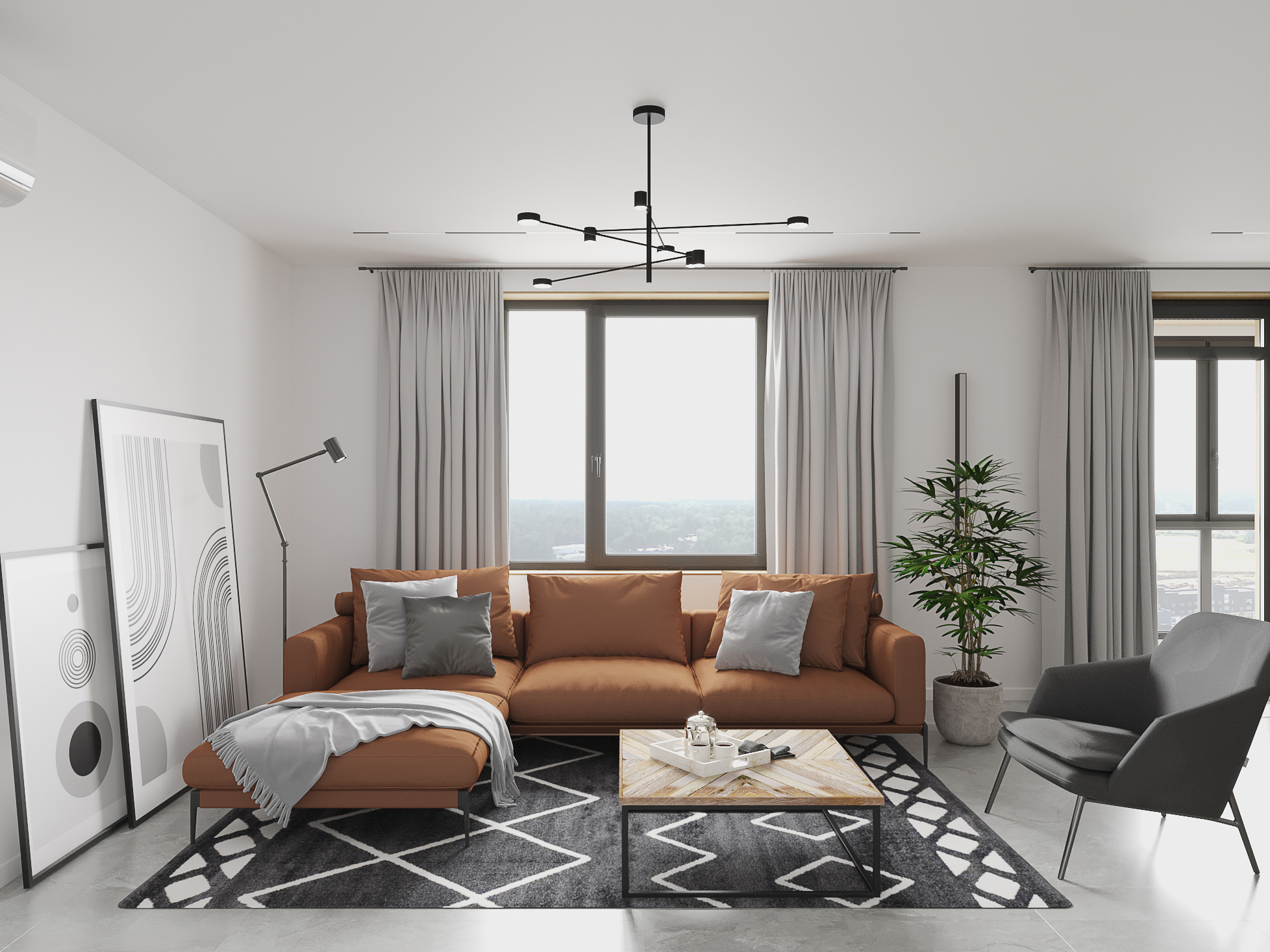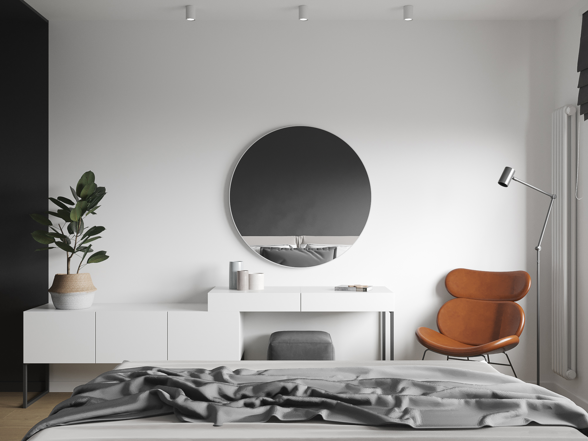 В отделке использованы светлые оттенки, цвет натурального дерева и графичные черные линии.