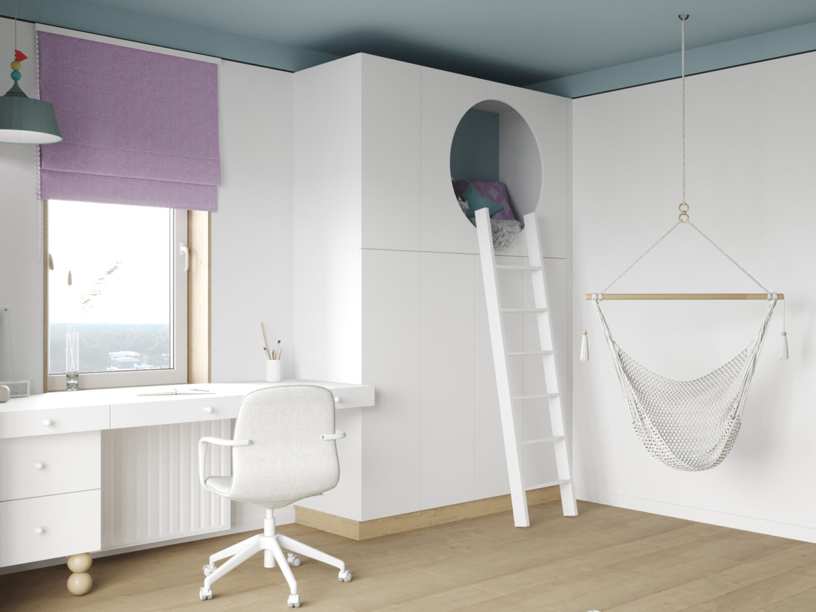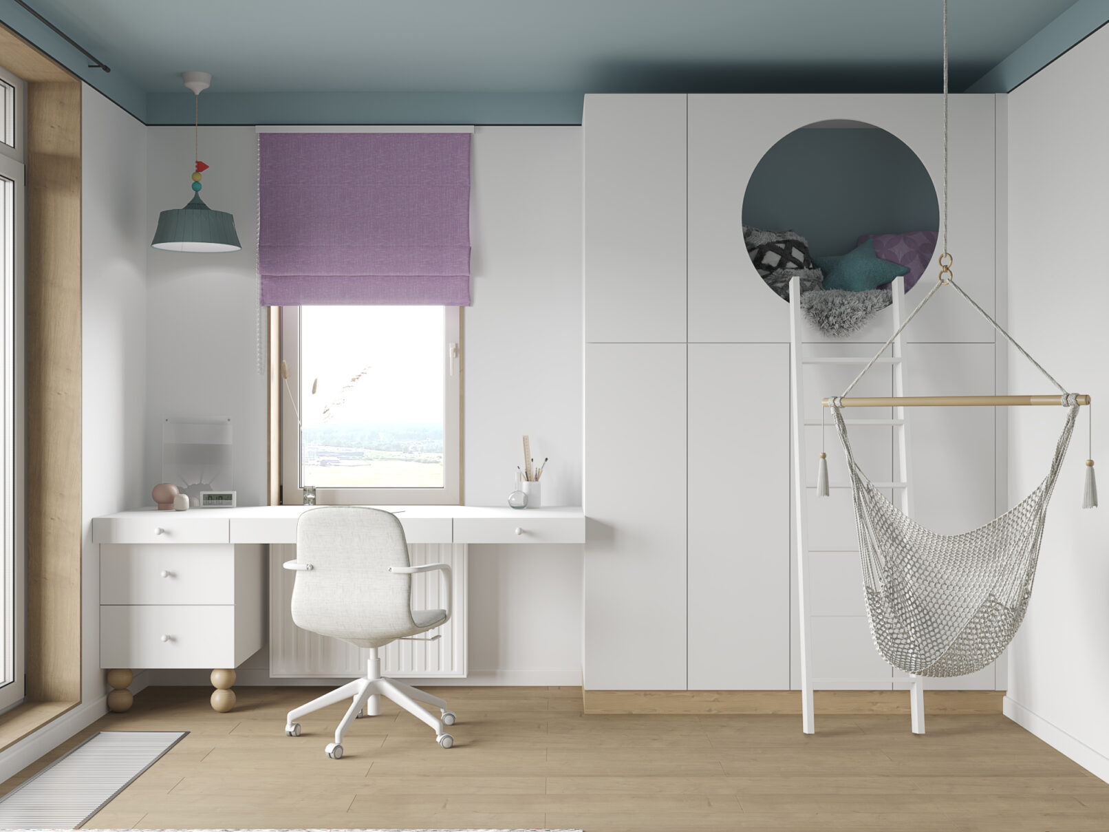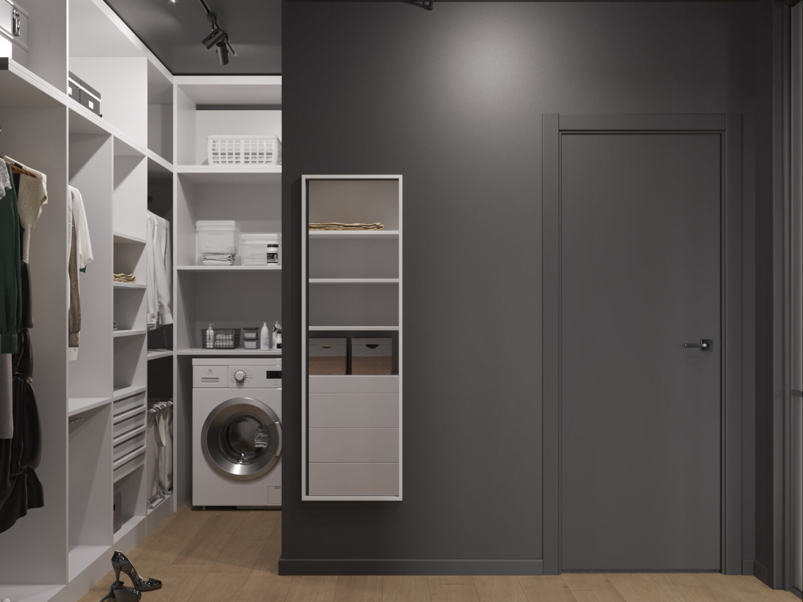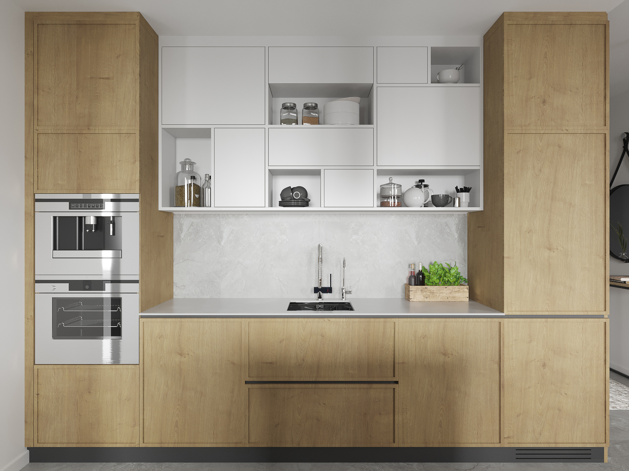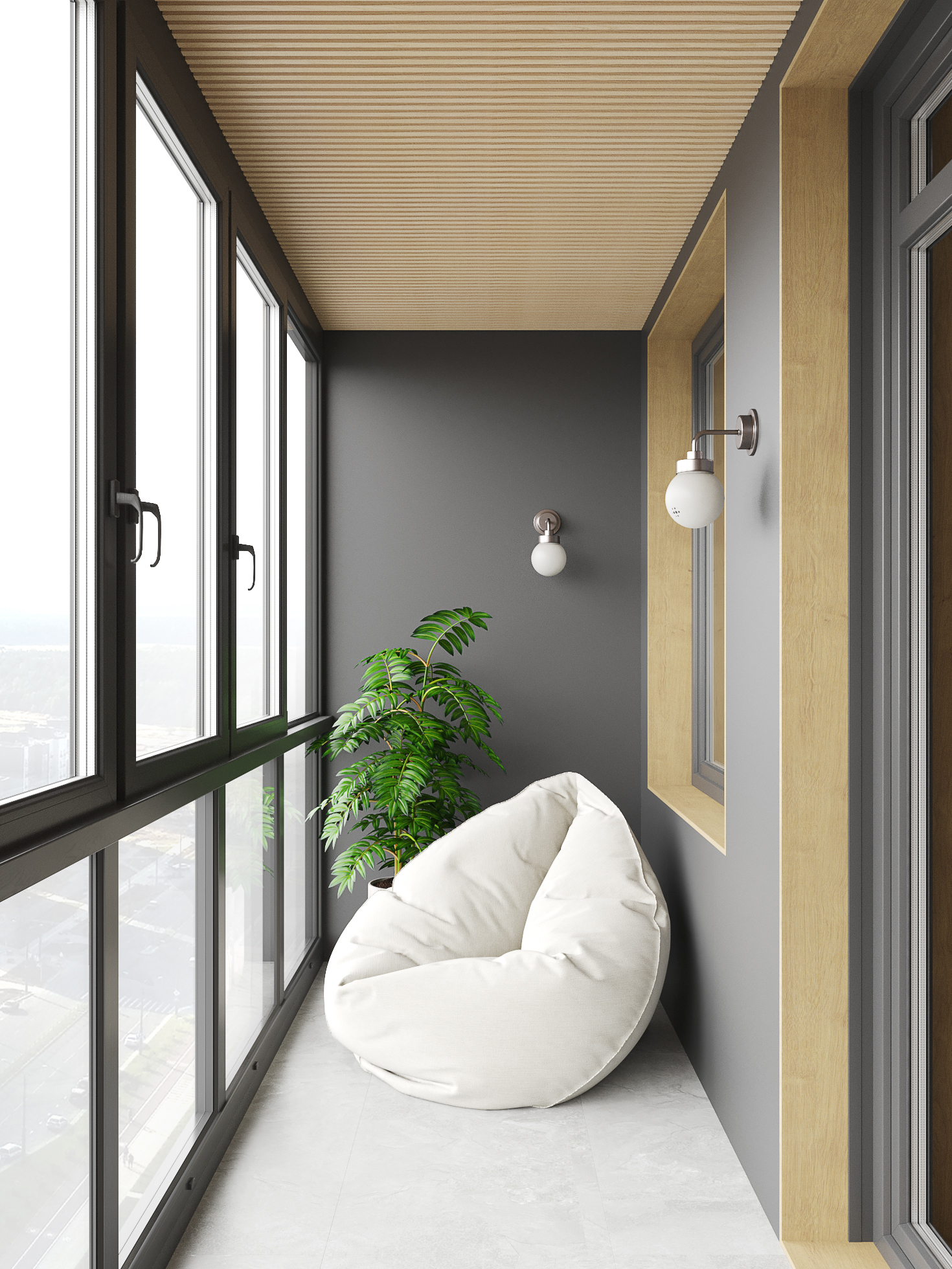 В отделке использованы светлые оттенки, цвет натурального дерева и графичные черные линии.