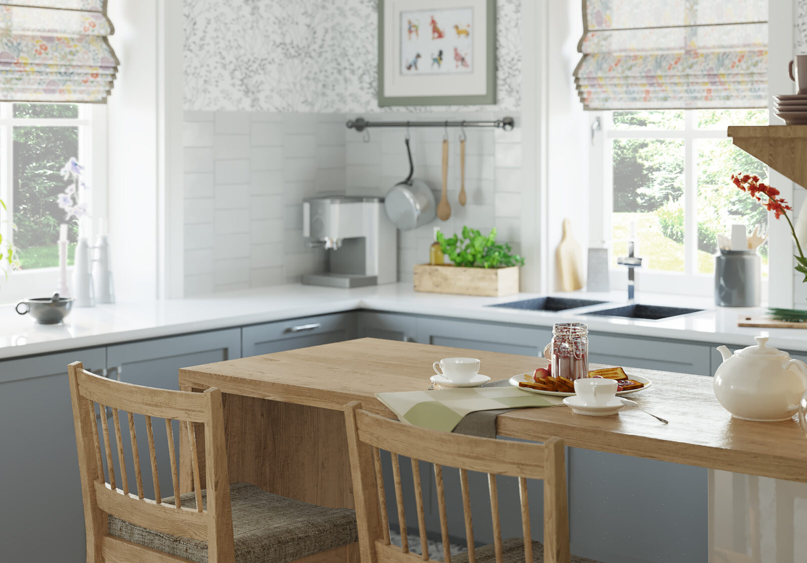 Я спроектировала большую кухню п-образной формы. Мойка разместилась возле окна, а барная стойка возле входа в кладовую. Таким образом, она не мешает проходу и приготовлению еды.